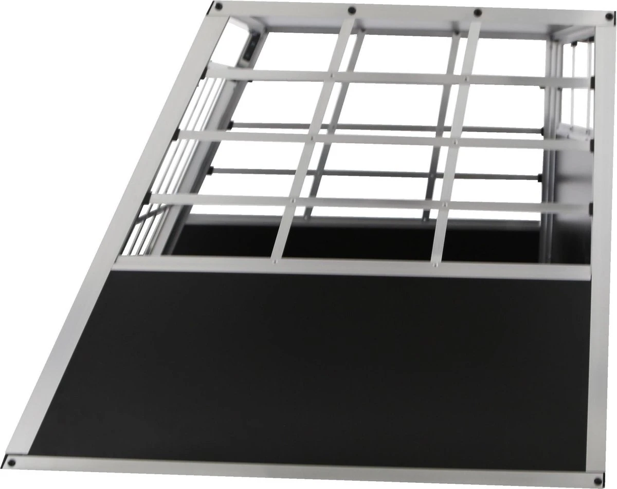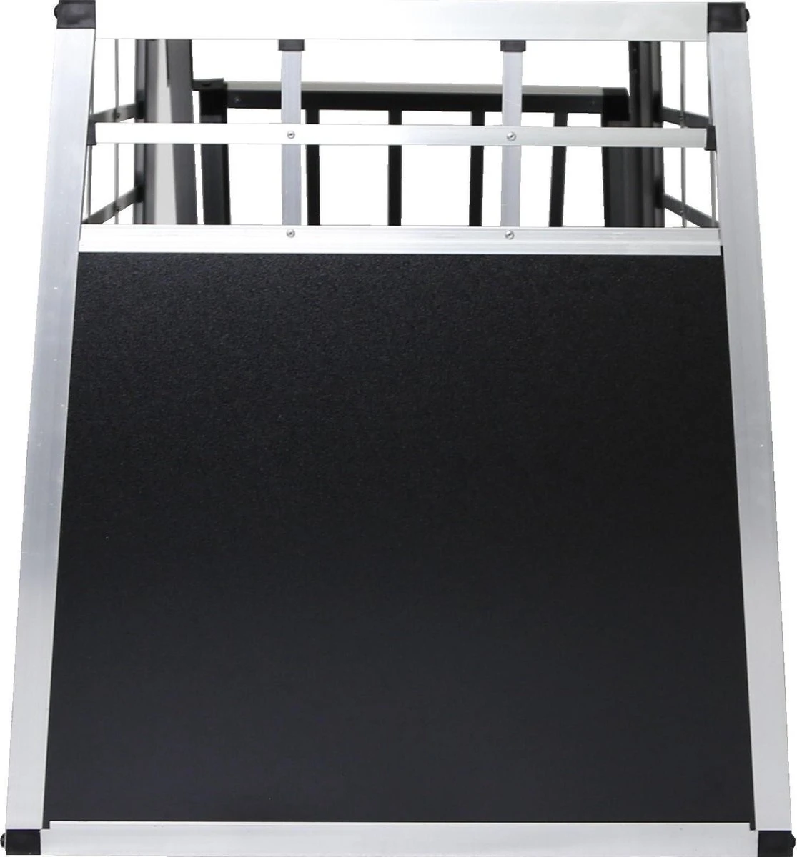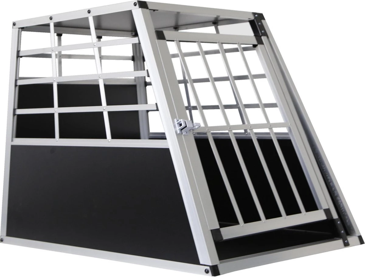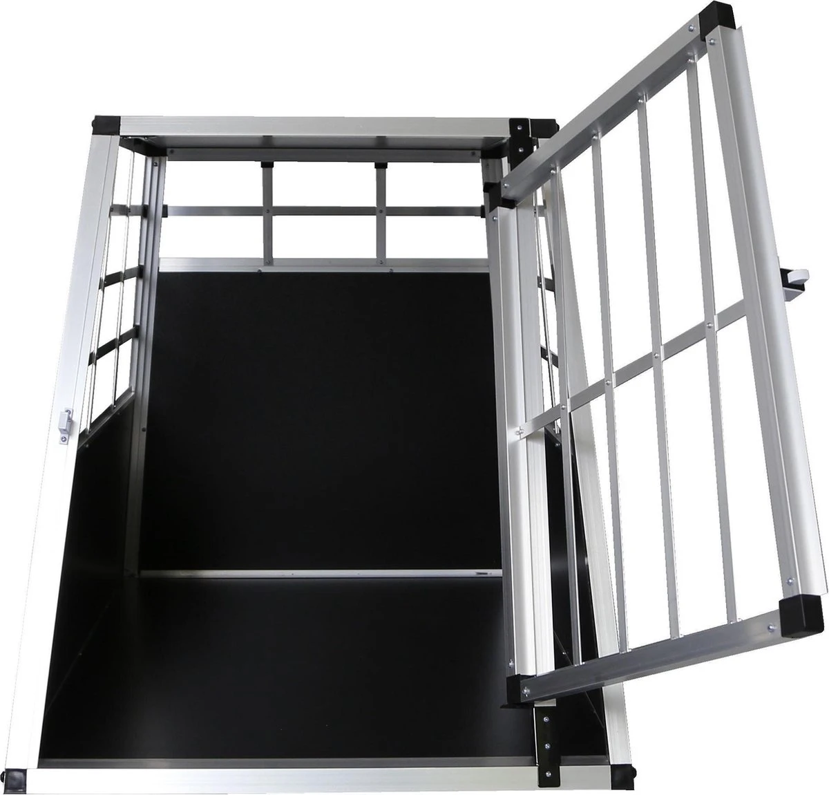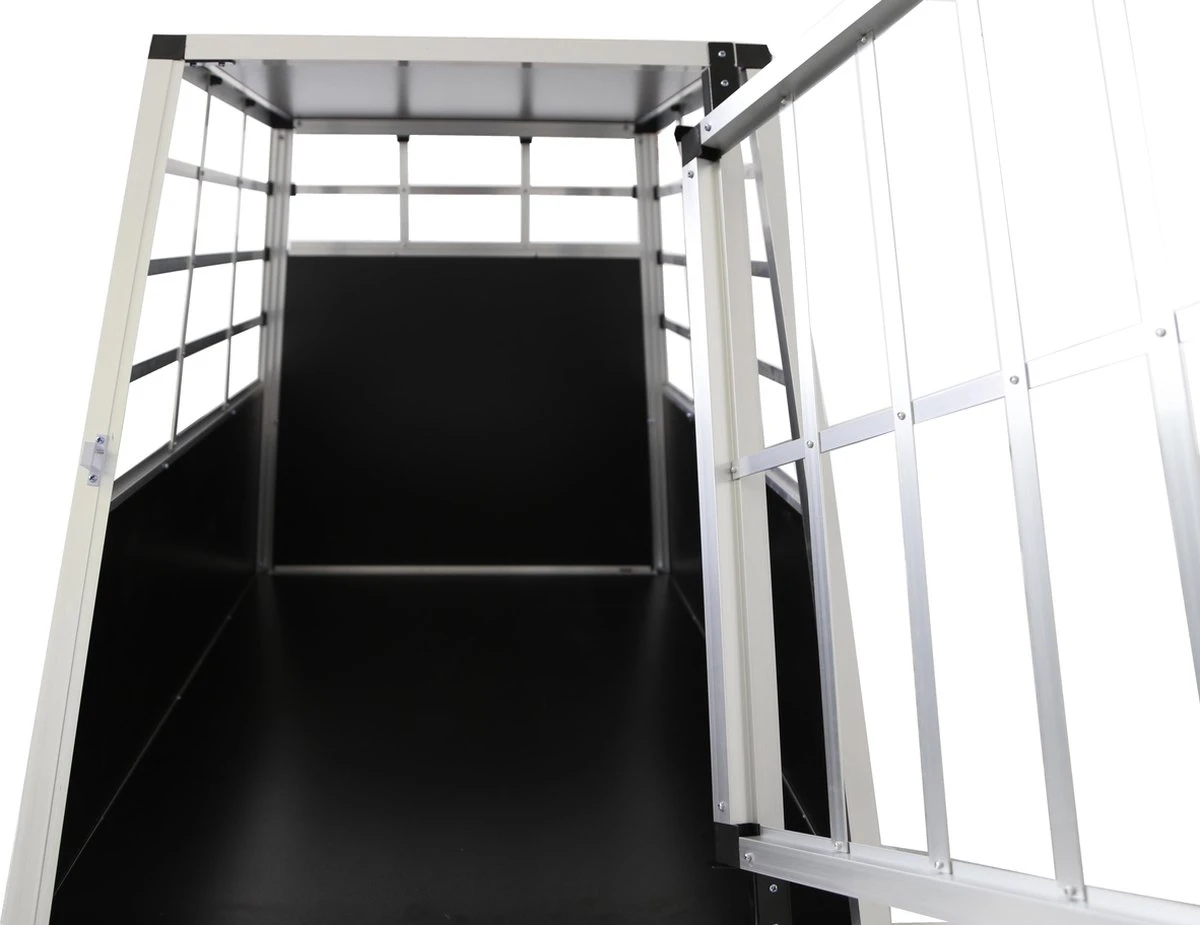 Aluminium Autobench – 65 (Breedte)x90(Diepte)x69(Hoogte) cm met 1 deur. De voorkant is schuin en de achterkant is haaks. Tevens is de diepte en hoogte van de bench groter voor uw hond om te liggen, want hij is 69cm hoog en 90 cm diep. Het is een extra hoge versie die met name geschikt is voor SUV en MPV auto’s en in veel gewone auto’s te hoog is.