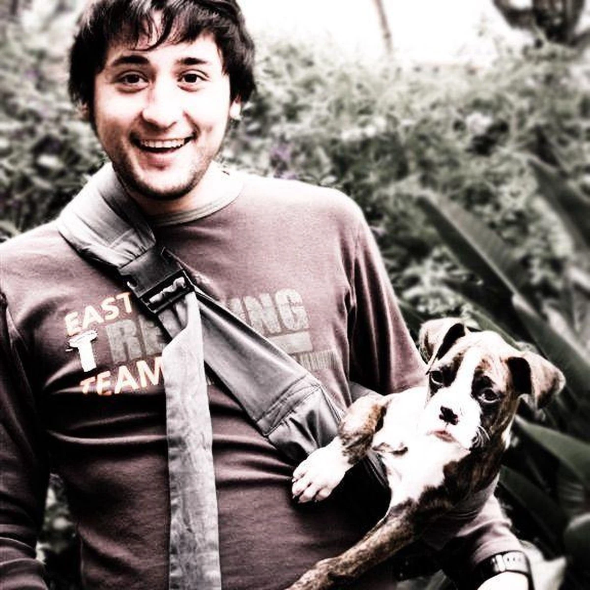 - Als je hond helemaal stevig in de draagzak zit, dan pas ga je staan