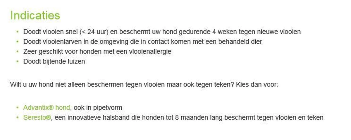 Advantage® is een snelwerkend middel dat vlooien en luizen doodt. De toediening is eenvoudig: je druppelt de inhoud van de pipet tussen de haren van je hond op de intacte huid.