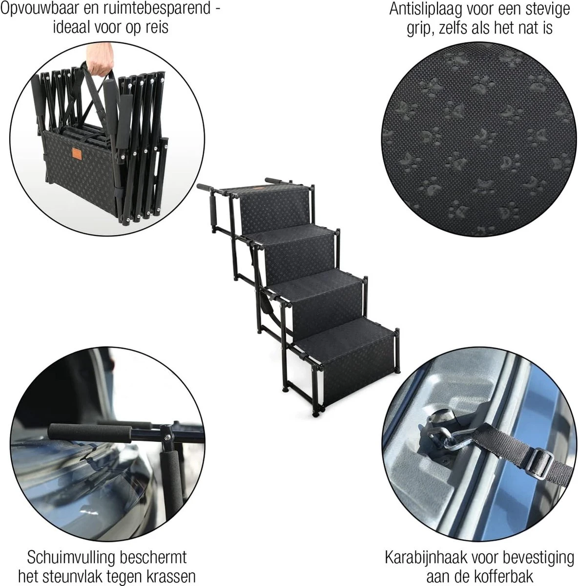 - De vier treden van de hondenladder met antislipbekleding zorgen voor een veilige grip, zelfs met natte poten, en zijn in hoogte verstelbaar