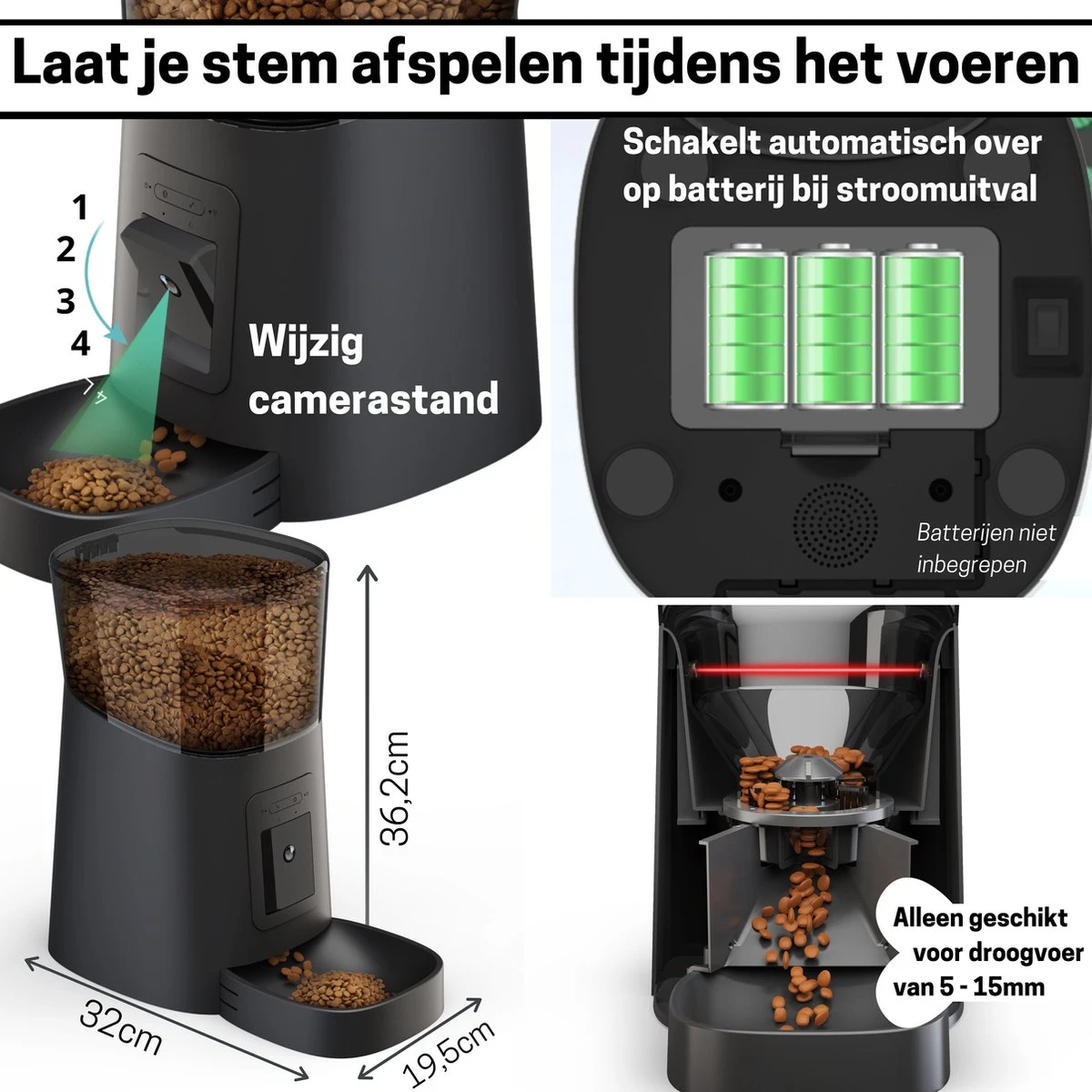 Met de gratis app kun je zelf instellen hoe vaak, wanneer en hoeveel voer het apparaat moet geven. De voerautomaat zal het ingestelde schema onthouden en iedere week herhalen. Dit is een ideale oplossing voor bijvoorbeeld huisdieren met een dieet, of gewoon om het gemakkelijker te maken voor het baasje. Natuurlijk kun je altijd handmatig een extra portie geven. Dit kan via de app, of door op de voerknop op het apparaat te drukken. Ook kun je tijdens elke voerbeurt je stem af laten spelen. Hierdoor weet je huisdier wanneer het voer klaar ligt en zo blijft het gewend aan je stem.