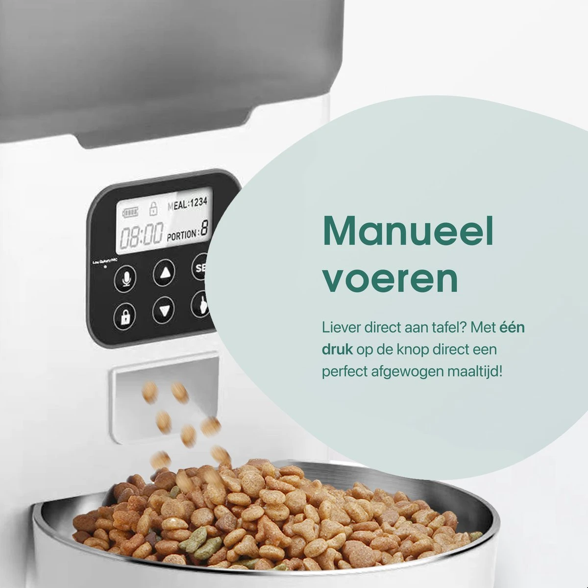 - Met 1 klik op de knop kan je je huisdier handmatig voeden