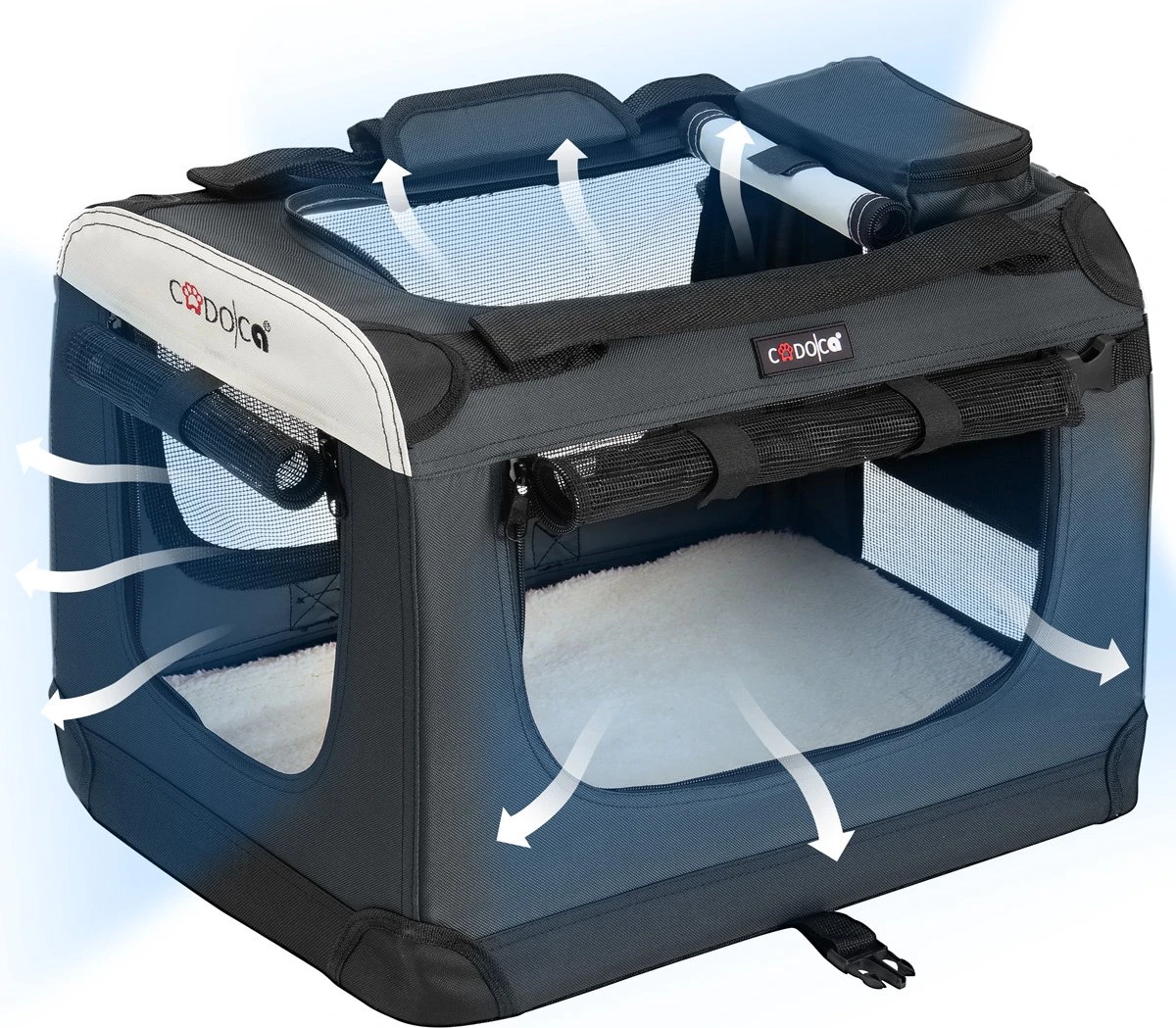 De opvouwbare transportbox is perfect geschikt, afhankelijk van de grootte, voor kleinere honden en katten tot grote honden. Dankzij het knuffelzachte dekentje biedt de box een comfortabele en fijne plek voor jouw viervoeter. De transportbox is door de opvouwbare stalen constructie snel gemonteerd en gedemonteerd en kan zo ruimtebesparend worden opgeborgen. De ingebouwde gaasjes aan de zijkanten zorgen voor een aangename luchttoevoer. De boven- en zij-ingangen kunnen met ritsen worden geopend en bieden een snelle en gemakkelijke toegang. Er is genoeg ruimte in de ruime vakken voor lekkers en speelgoed voor uw viervoeter. De stof is afneembaar en gemakkelijk te reinigen.