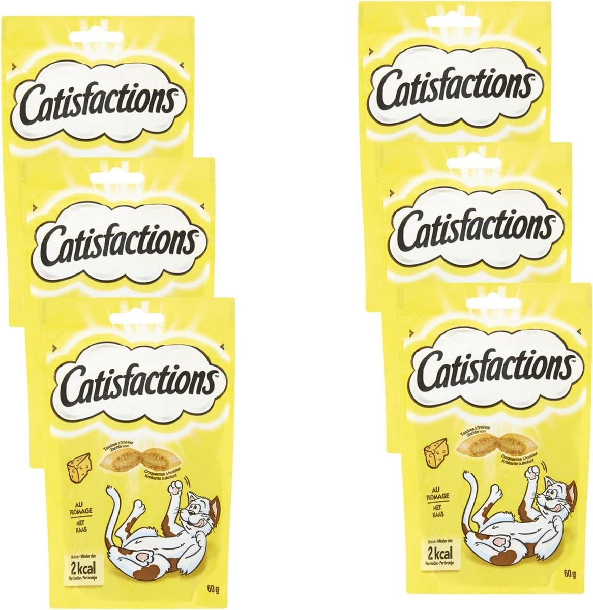 Deze verpakking bevat 6 zakjes Catisfactions kaas à 60 gram.
