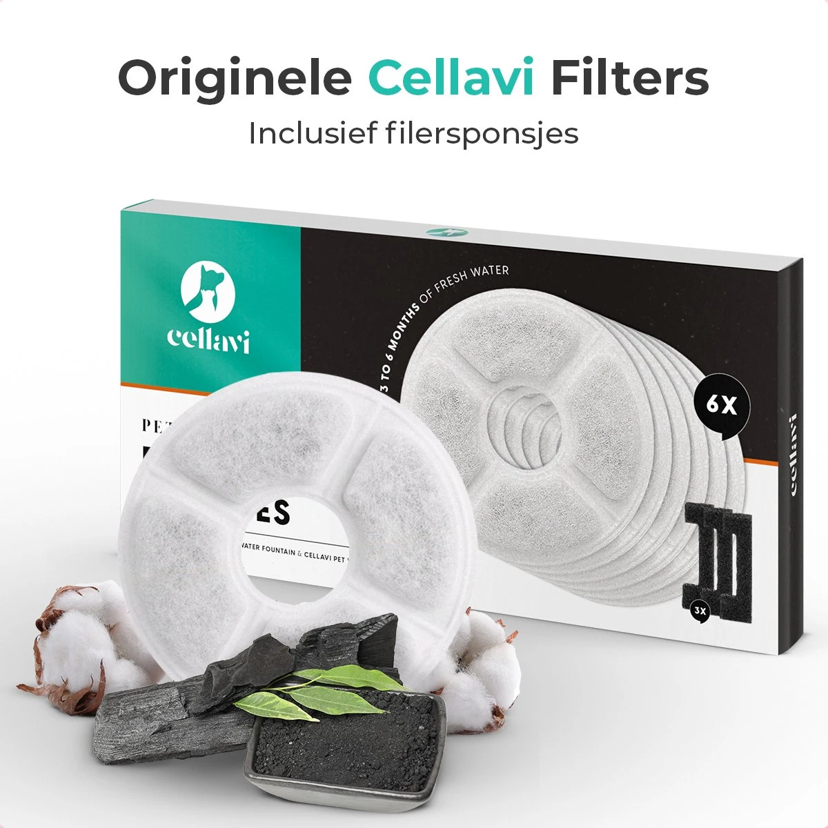 - Voorziet van filtersponsjes die alleen geschikt zijn voor de Cellavi XL Drinkfontein & Cellavi Drinkfontein