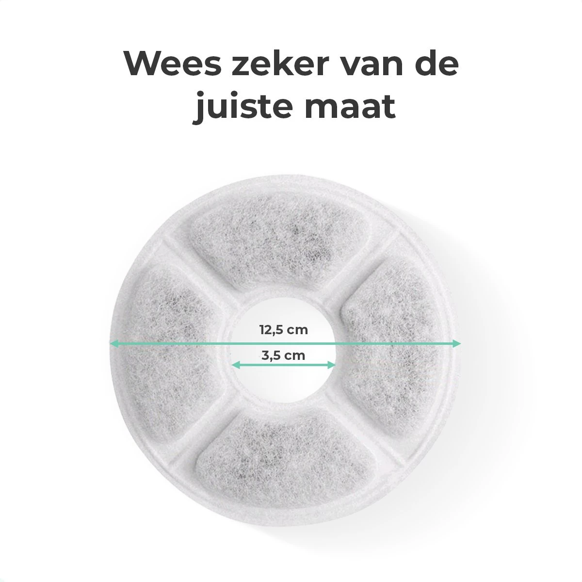 De filters zijn op maat gemaakt voor de meeste drinkfonteinen. Om zeker te zijn van de juiste maat controleer je de diameter van het gat (3,5 cm) en van de filter (12,5 cm). Heb je de Cellavi XL Drinkfontein of Cellavi Drinkfontein dan ben je met deze navulling set altijd zeker van de juiste maat.