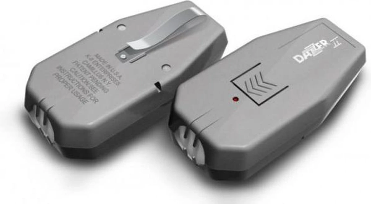 Het zendertje van de Dazer werkt op een vervangbare 9 volt alkaline batterij. Deze is goed voor ruim 1000 keer een signaal ofwel 3 à 4 jaar gebruik. Vaak nog langer. De Dazer zelf gaat veel langer mee. De Dazer is made in de USA en weegt slechts 122 gram inclusief batterij en bevestigingsclip en is 11 cm lang, 5cm breed en 3 cm dik.