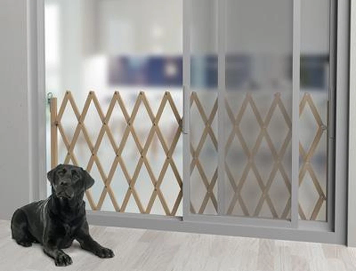 Dit houten hondenhek overspant de volle breedte van de doorgang en is makkelijk met één hand te openen middels het harmonica-systeem