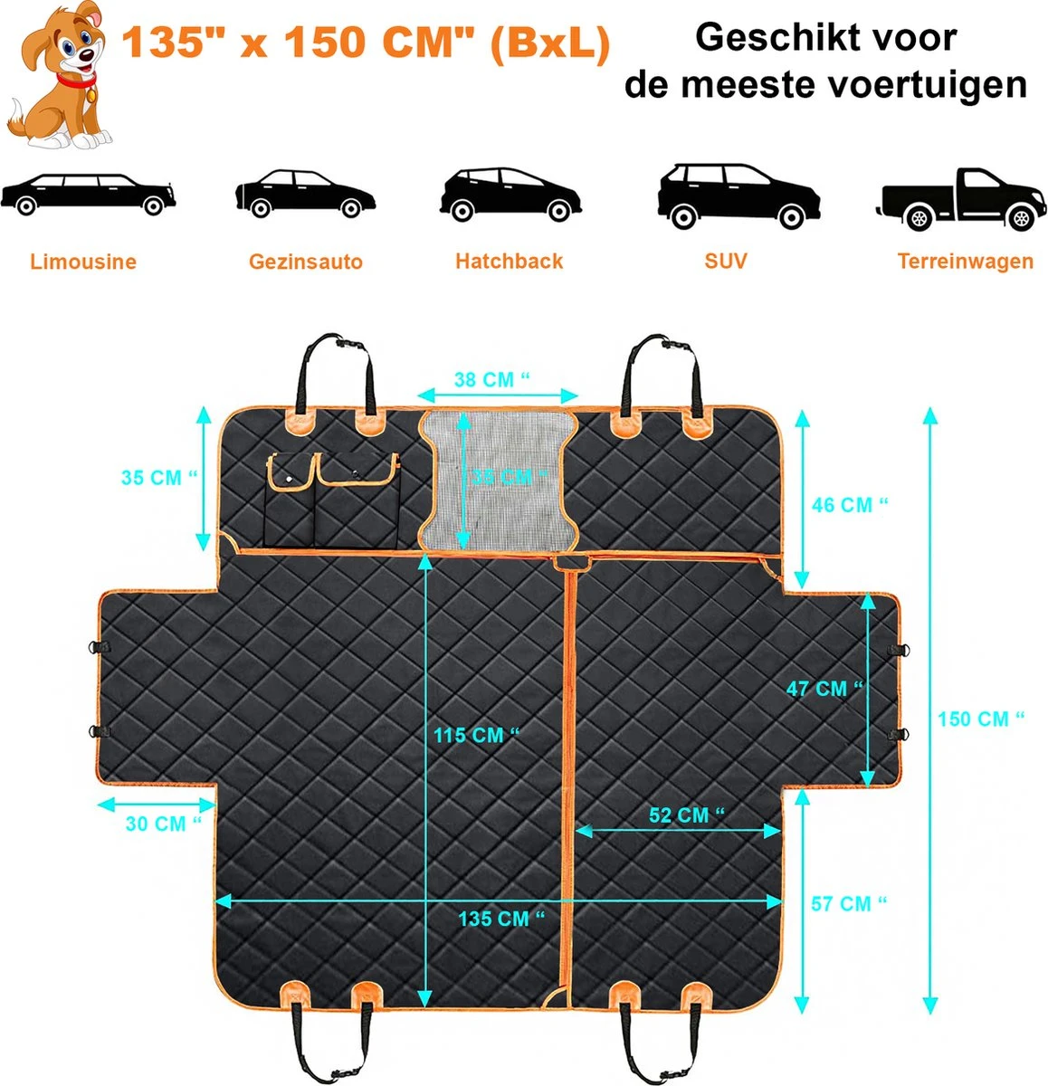 - Te gebruiken als: achterbank, passagierstoel of kofferbak beschermhoes