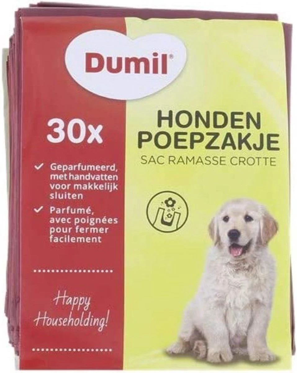 Hondenpoepzakjes van het merk Dumil (dumil dog waste bag). De Dumil Hondenpoepzakjes zijn geparfumeerd en maskeren ongewenste geurtjes en de lussen zorgen voor een goede sluiting na gebruik.
