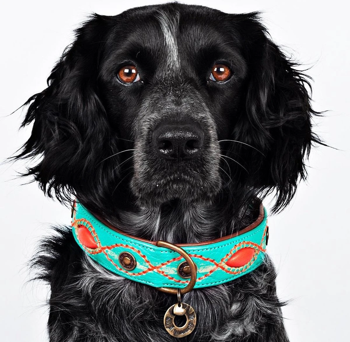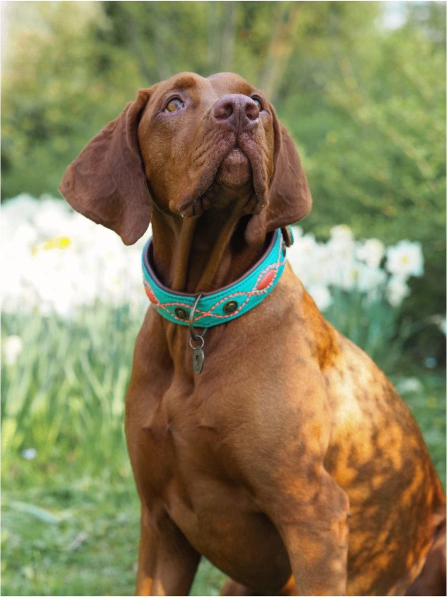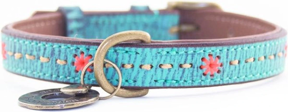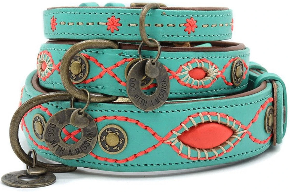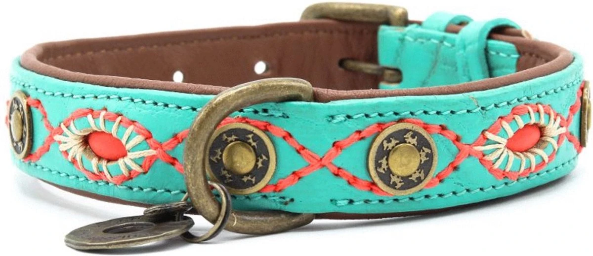 Aan het uiterlijk van je hond, kan je niet zoveel veranderen. Wel kan je zijn outfit pimpen door middel van een mooie halsband. De Janis Multi-Color van Dog With A Mission is een handgemaakte, oersterke halsband voor je viervoeter. De Janis Multi-Color is gemaakt van leer met turquoise en roze details voor een bohemian look. De halsband wordt afgemaakt met een bedeltje.