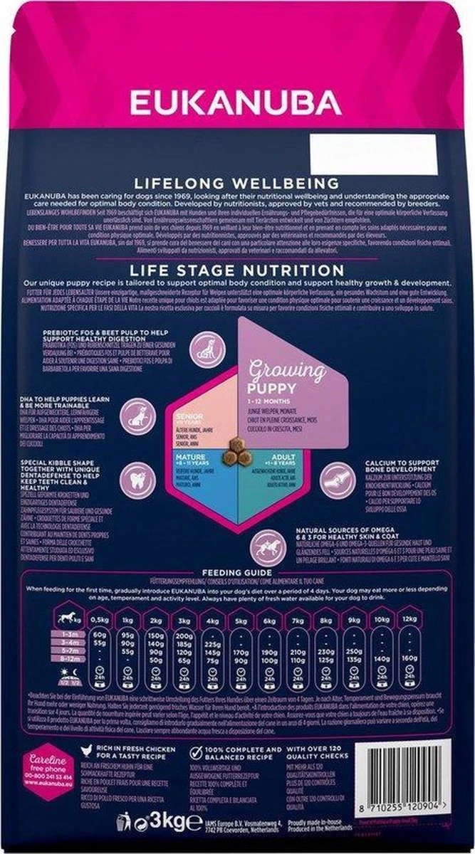 Eukanuba’s beste puppyvoer voor kleine rassen, aanbevolen voor kleine honden zoals Yorkshireterriërs, mopshonden, buldogs en Maltezers. Deze Eukanuba-voeding heeft ons hoogste eiwit- en vetgehalte*, specifiek ontwikkeld voor puppy’s van kleine rassen, omdat zij meer calorieën verbranden en meer energie per kilo lichaamsgewicht nodig hebben dan puppy’s van grotere rassen. Ook bevat deze voeding omega-6- en omega-3-vetzuren in een optimale verhouding voor een gezonde huid en een glanzende vacht voor uw pup, en dierlijke eiwitten (kip is het belangrijkste bestandsdeel) die helpen bij de ontwikkeling van sterke, soepele spieren. Van de DHA is bovendien klinisch bewezen dat deze helpt bij de ontwikkeling van slimme, goed te trainen puppy’s. Eukanuba Puppy & Junior droge hondenvoeding voor kleine rassen is ontwikkeld in samenwerking met dierenartsen en wordt aanbevolen door topfokkers. Het bevat 100% van de voedingsstoffen en is helemaal uitgebalanceerd om uw pup gezond te helpen groeien.