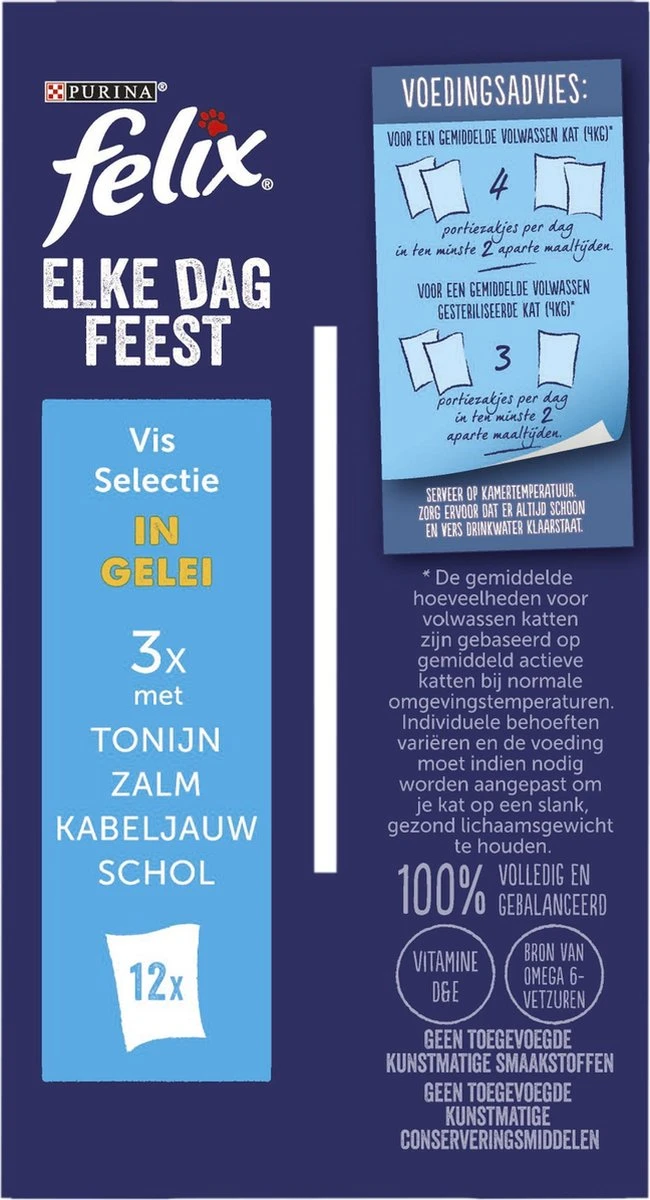 Felix Elke Dag Feest is een assortiment onweerstaanbare maaltijden die er zó lekker uitzien, zó lekker ruiken en zó lekker smaken alsof je het zelf hebt klaargemaakt! Speciaal bereid met zachte stukjes in een overheerlijke gelei. Jouw deugniet zal elke keer weer genieten van een onweerstaanbare maaltijd. Deze heerlijke maaltijden vormen ook een bron van essentiële omega 6-vetzuren met de juiste combinatie van uitgebalanceerde vitaminen die jouw kat energie zullen geven en klaar zullen maken om nog meer kattenkwaad uit te halen. Ze zitten vol gezonde ingrediënten om 100% te voldoen aan de behoeften van jouw kat indien gevoed volgens de voedingsrichtlijnen op de verpakking. Felix – gewoonweg onweerstaanbaar!