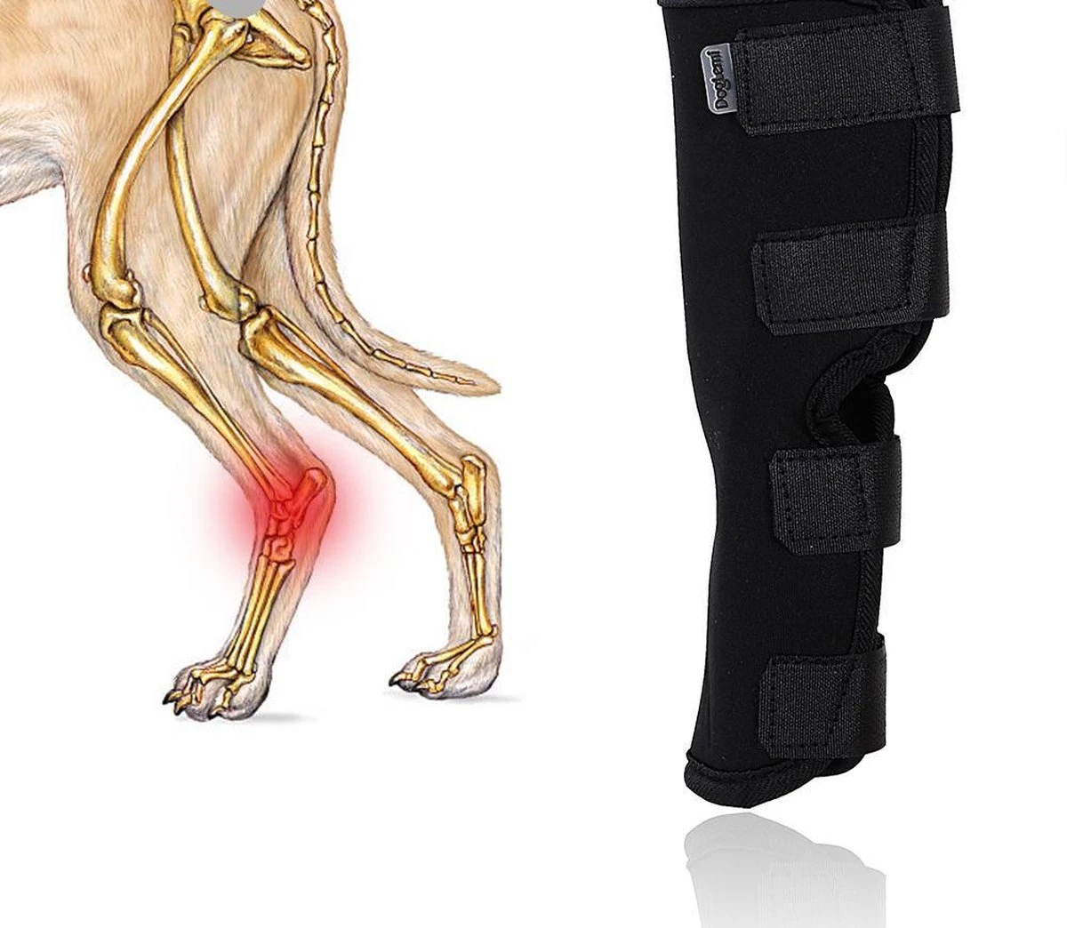 De brace is sterk steungevend en beschermt de hond zijn gewrichten.