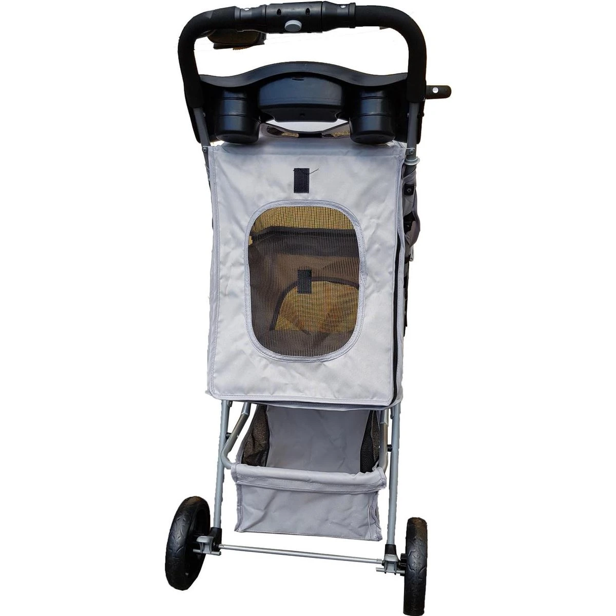 Met deze handige hondenbuggy gaat jouw kat of hond overal mee naartoe! Deze buggy is gemaakt van polyster en extra licht: het hele geheel weegt maar 4,6 kilogram. Ideaal om dieren mee te nemen die angstig zijn, oud, ziek of erg jong en daarom niet veel kunnen of mogen lopen. De buggy is goed geventileerd en heeft gaas-inzetstukjes die scheur- en bijtvast zijn, zodat jouw dier om zich heen kan kijken als het daar behoefte aan heeft. Het zicht is deels afdekbaar, waardoor jouw dier zich veilig en afschermd voelt op drukke plekken. Het uitneembare kussen zorgt voor extra comfort. Ook voor de eigenaar is het bovendien fijn lopen, want de buggy loopt zeer licht en heeft zwenkwielen schokdempers. Door de twee parkeerremmen kun je de buggy veilig stilzetten en de grote openingen zorgen dat je altijd makkelijk toegang hebt tot jouw dier. De korthouders zorgen ervoor dat jouw dier niet uit de buggy kan springen. Daarnaast is de buggy in te klappen en is dan zeer compact, ideaal om mee te nemen in de auto.