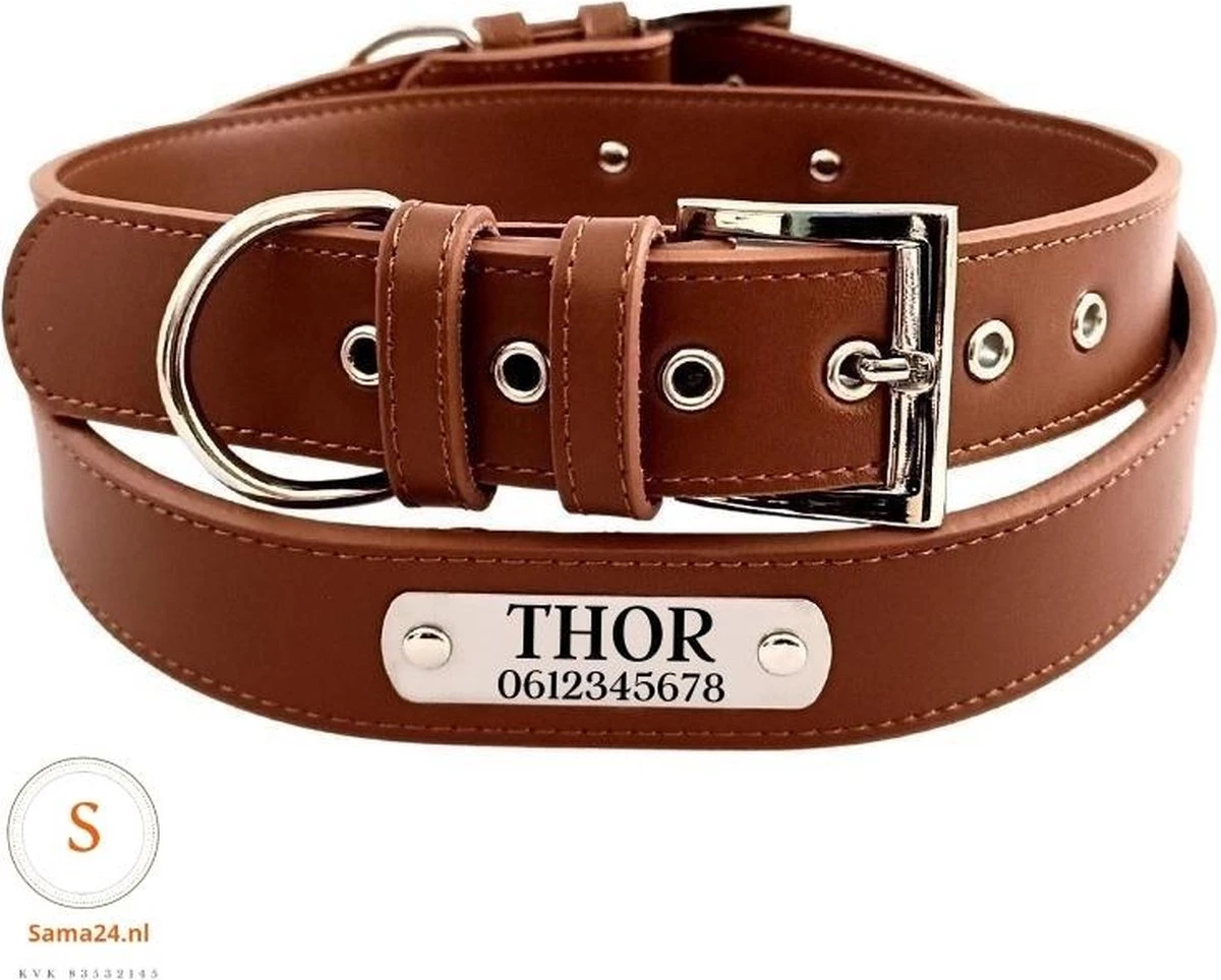 Elke stoere hond heeft deze leren graveerde leren hondenhalsband met naam en telefoonnummer nodig. Laat daarom je naam en telefoonnummer op deze mooie leren honden halsband met naam graveren. Want hiermee zorg je ervoor dat je hond altijd veilig de weg terug vind.