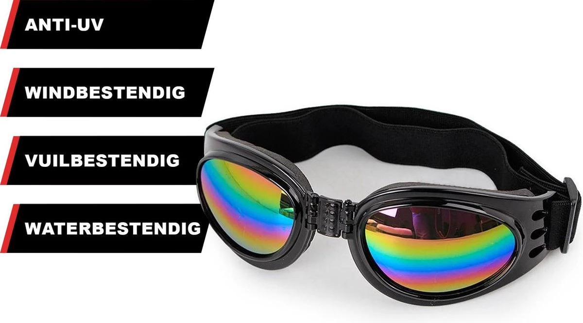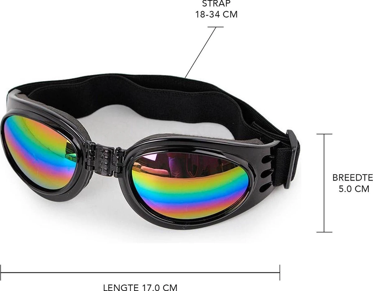 De Hondenbril beschermt uw hond tegen niet alleen tegen UV-stralen van de zon, maar is ideaal te gebruiken tijdens fietsritjes, op de motor of in een cabrio. Hierdoor kan uw hond comfortabel overal mee naartoe. De honden zonnebril is uitgerust met schuimkussens die rondom de glazen zitten, wat het draagcomfort vergroot. De banden zijn verstelbaar rond het hoofd en de kin en kan daardoor door honden van elk formaat gedragen worden.