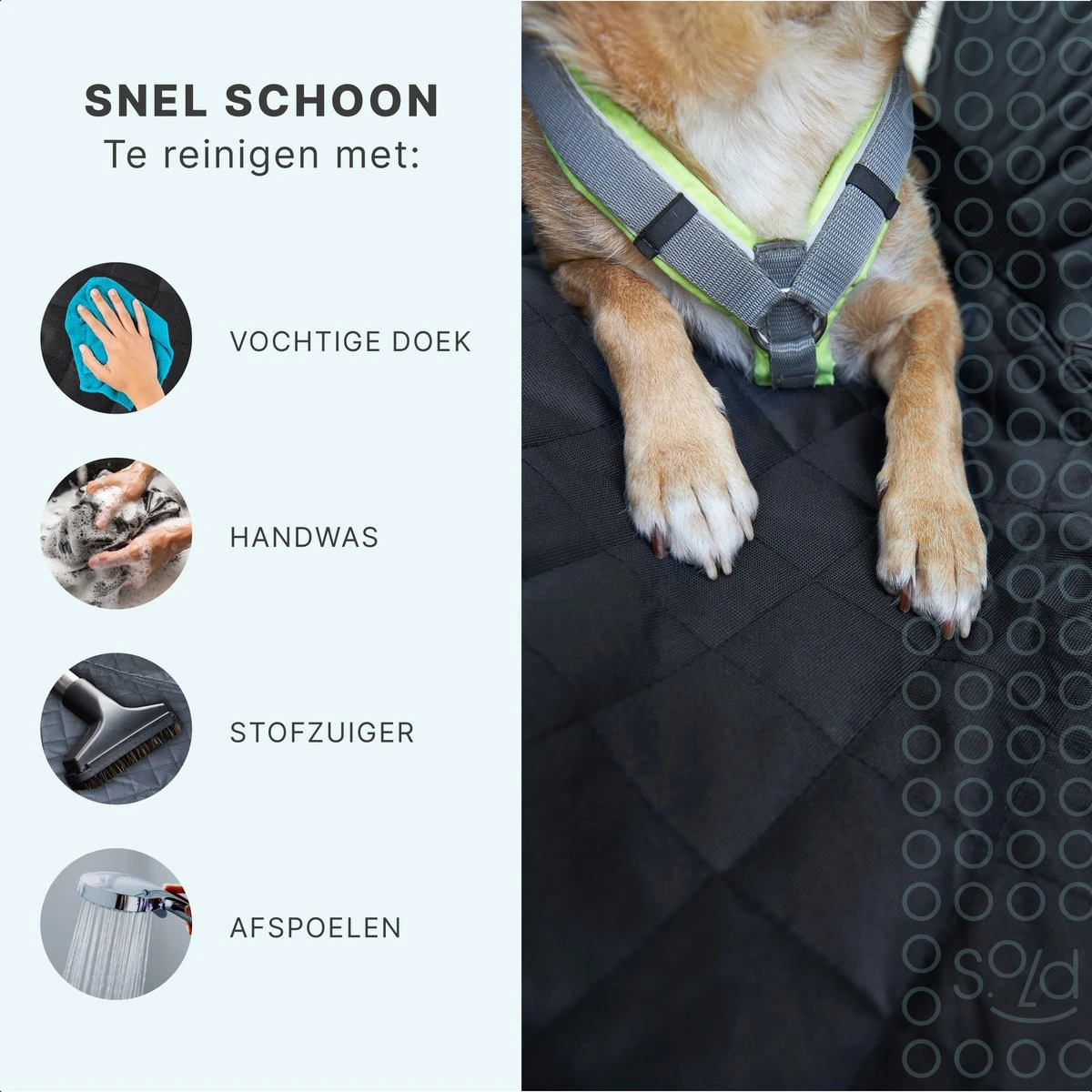 De stevige kwaliteit van deze hondendeken beschermt je auto niet alleen tegen vuil maar ook tegen beschadigingen. Met de kliksluitingen bevestig je de hoes gemakkelijk aan de hoofdsteunen van de voorstoelen en aan die van de achterbank. Door de instophendels die tussen de rugleuning in gestoken kunnen worden en de antislip onderkant blijft de deken stevig op zijn plaats liggen. De zijkanten kun je omhoog ritsen zodat de armleuningen schoon en onbeschadigd blijven van hondennagels en zorgen er tevens voor dat je hond niet zomaar uit de auto kan springen. Je kunt de deken afnemen met een vochtige doek.