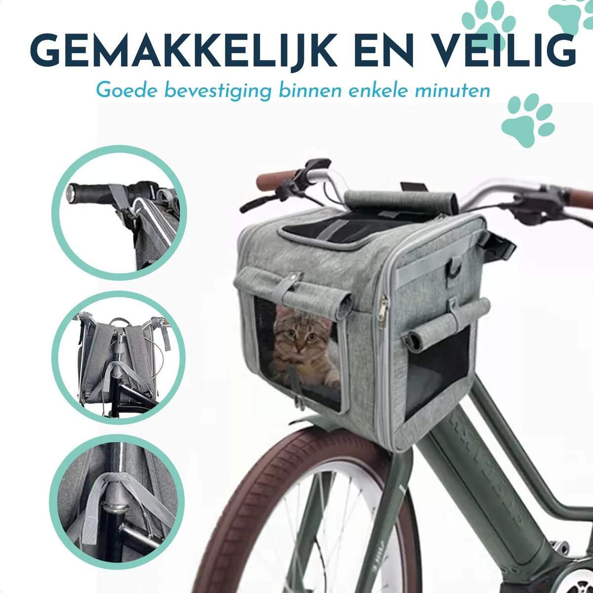 De mand is volledig waterbestendig zodat de mand droogt blijft als het regent. Daarnaast is de mand gemaakt van hoogwaardige materialen de mand is daarom 100% veilig. Je kunt gemakkelijk je viervoeter met het ingebouwde tuigje vastmaken.