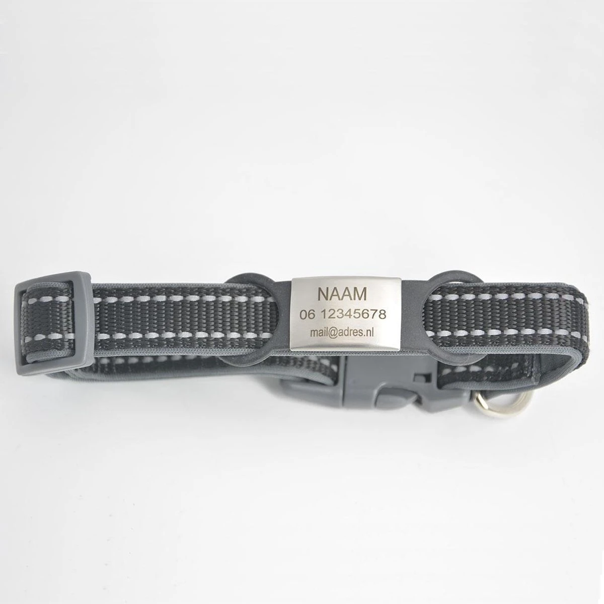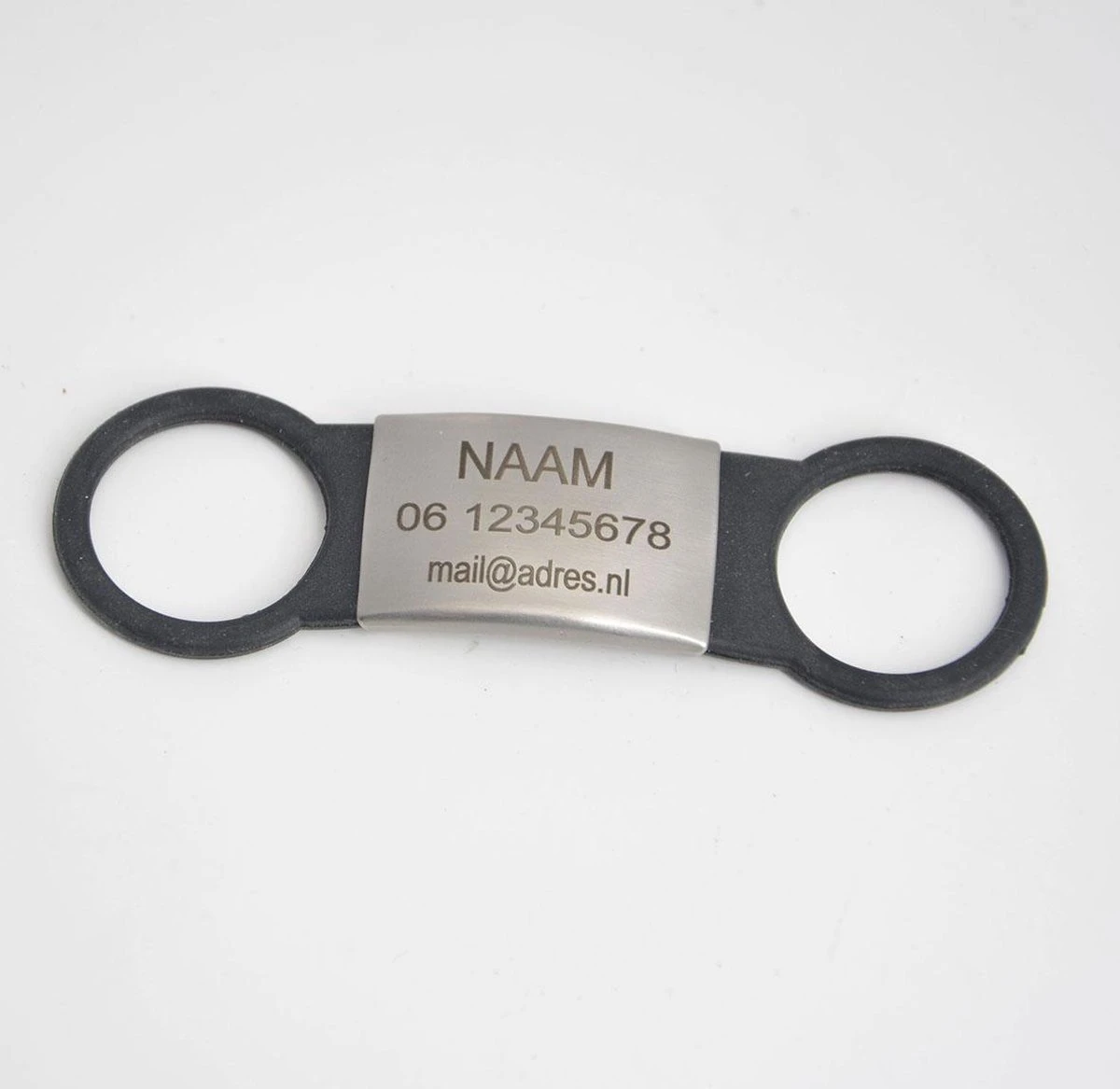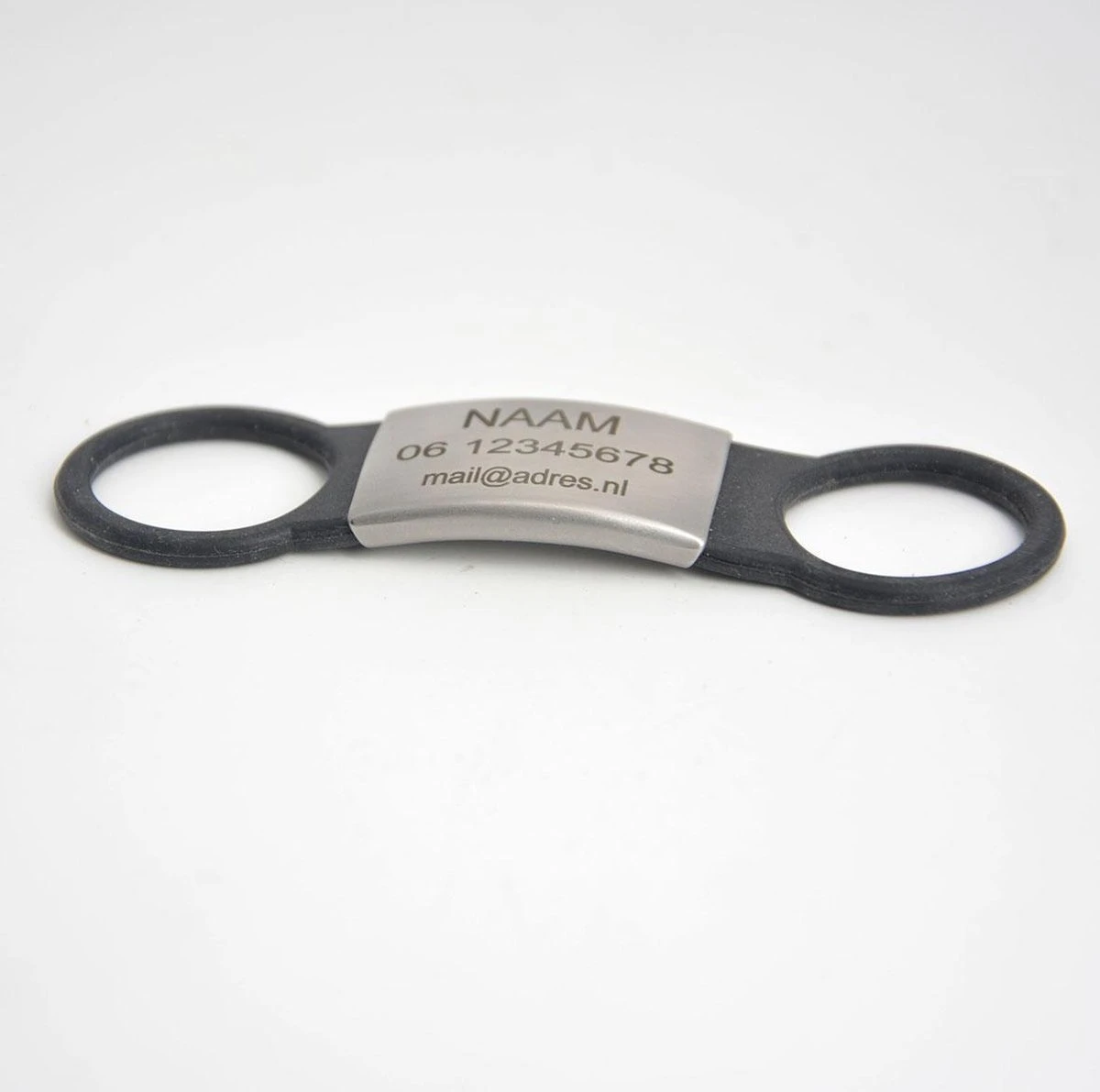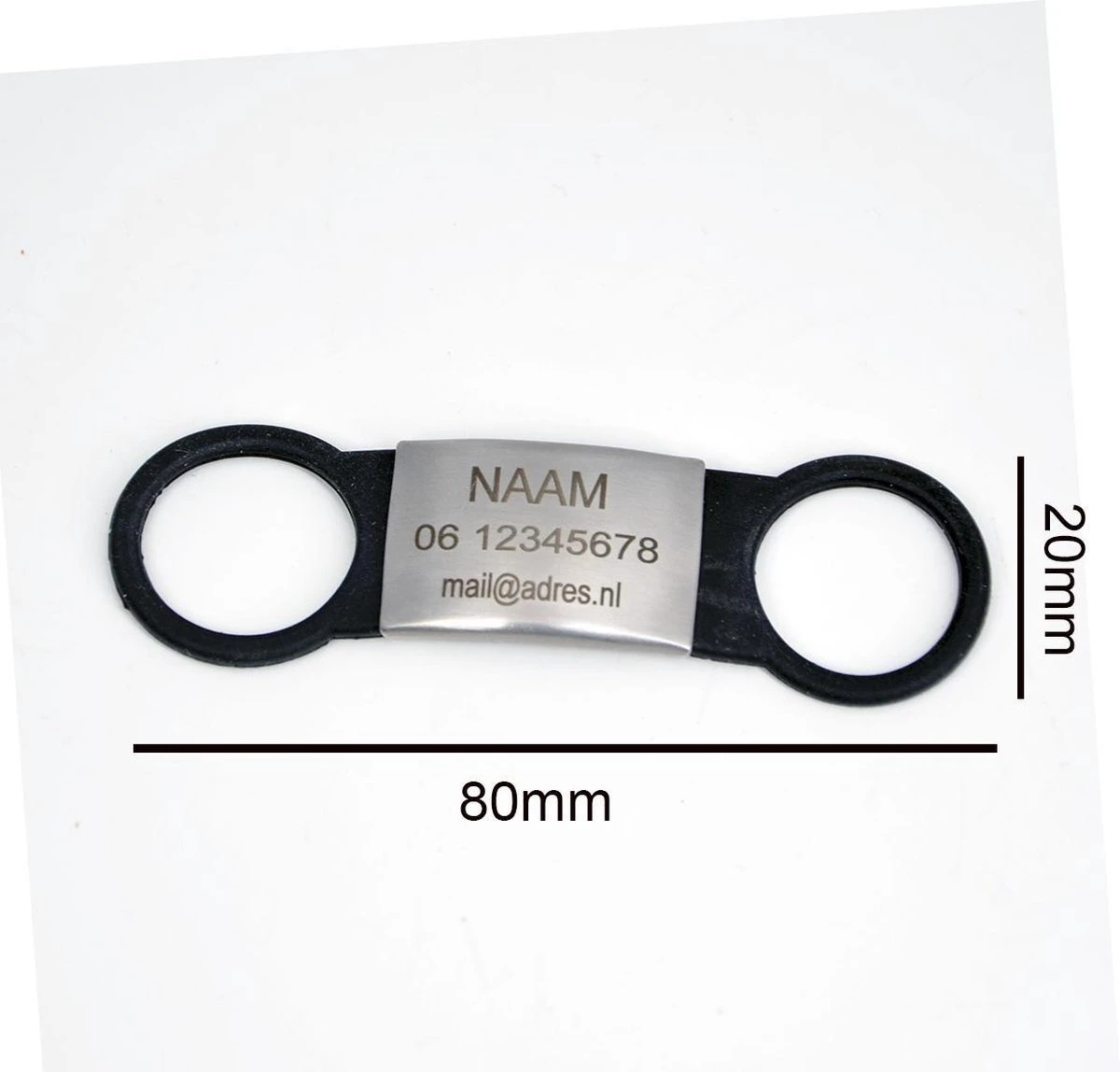 Een stevige RVS penning die strak tegen de halsband aanzit. Daardoor geen loshangende delen aan uw viervoeter die kunnen blijven haken. Ook de kans op verliezen wordt een stuk minder. Deze kwalitatief hoogwaardige RVS penning 30 x 20 mm wordt geleverd met een siliconen bevestigings bandje met ogen om deze over de halsband te schuiven.
