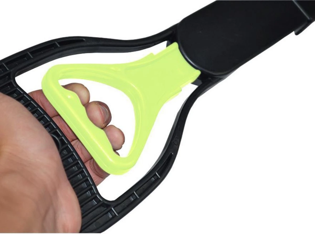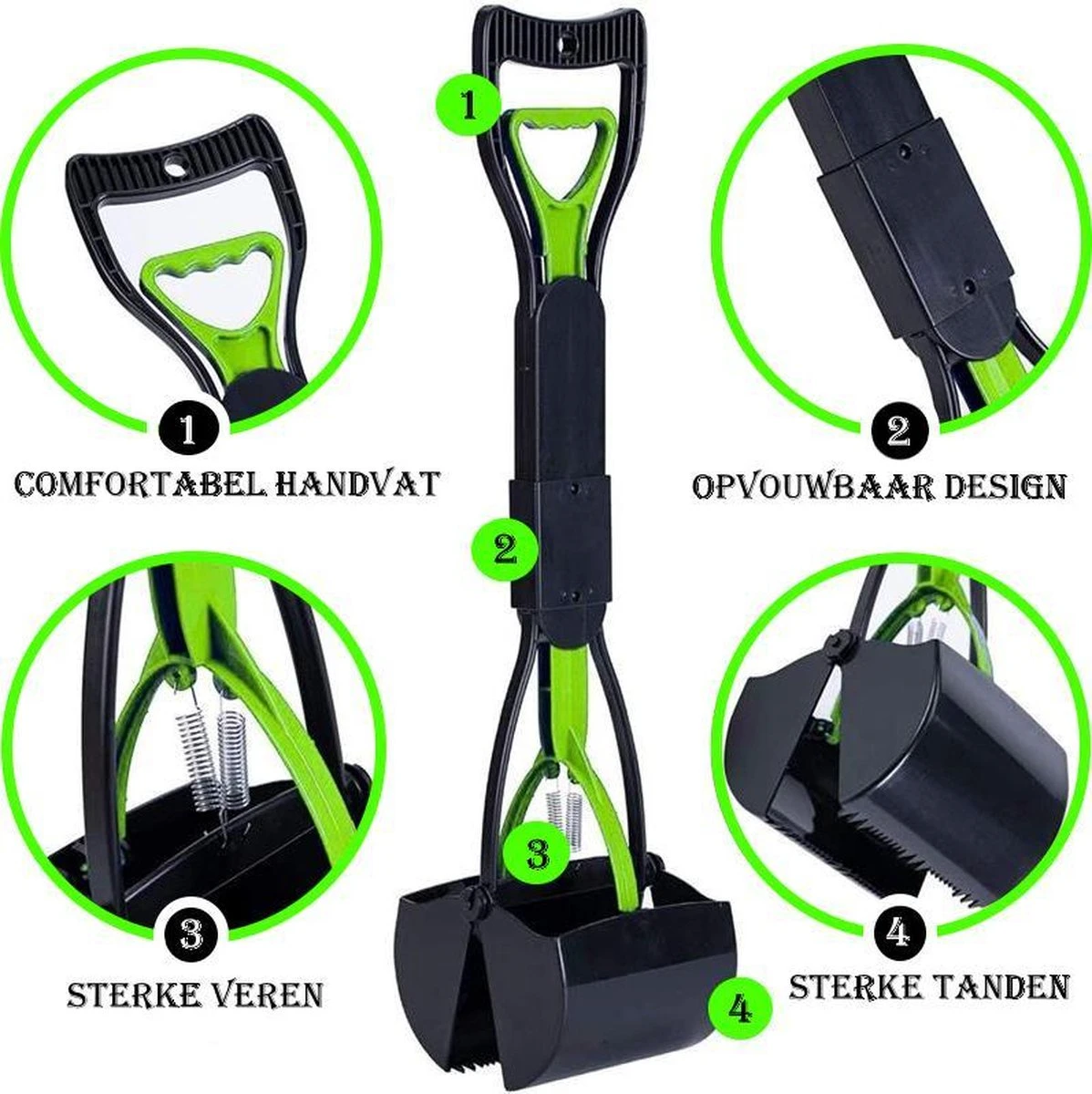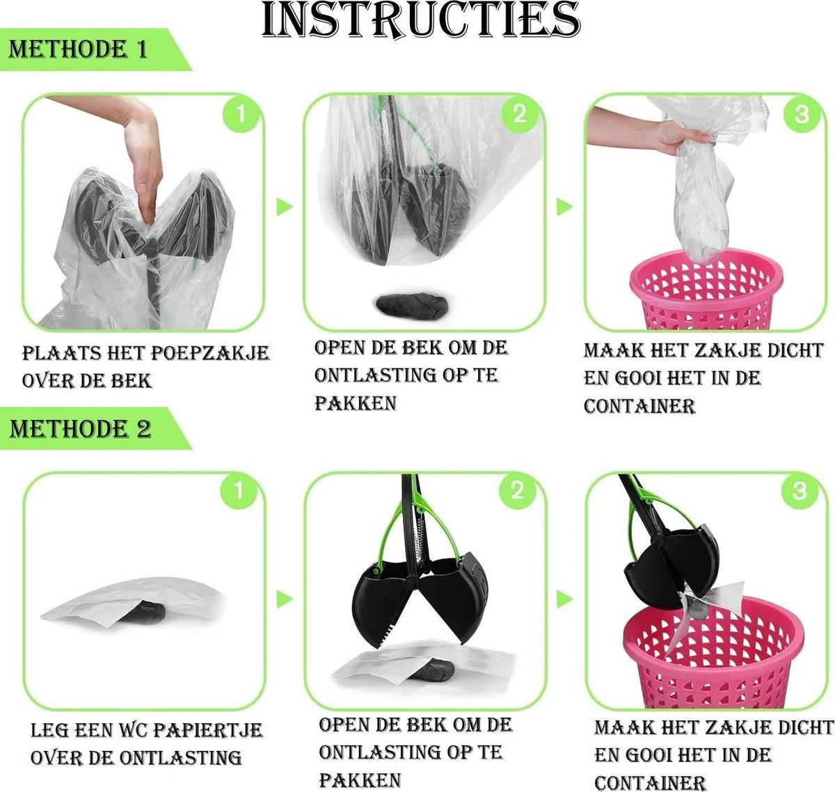 De hondenpoepschep is gemakkelijk in gebruik. Vouw hem uit doe een hondenpoepzakje in de opening en pak de poep van de grond. Knoop het zakje dicht en gooi de hondenpoep in de prullenbak.