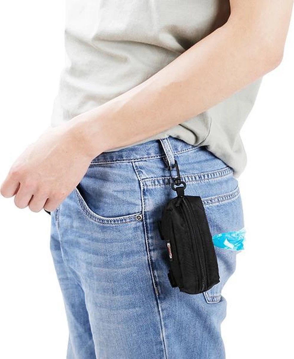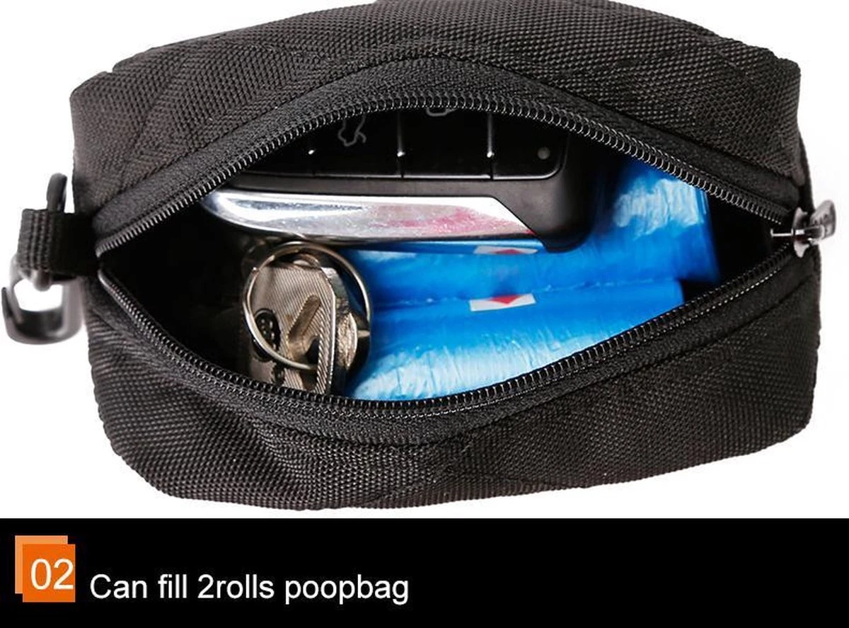 Dit handige tasje is de oplossing voor U.Er kunnen met gemak twee rolletjes poepzakjes in opgeborgen worden en is voorzien van een sluis om de zakjes er één voor één uit te trekken.Discreet , handig en modieus tegelijk.Het tasje kan aan de riem gehangen worden, gewoon meegedragen worden of met velcro strips aan bv de leiband bevestigd worden.Het is dus altijd binnen handbereik en kan op deze manier niet vergeten worden.