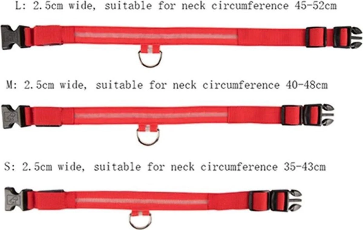 Bescherm je hond tegen alle gevaren van de wereld. oplaadbaar, met intrekbare band, 3 flitsmodi. Eenvoudig te bedienen: schakel tussen 3 knipperende motieven met een druk op de knop. Geschikt voor kleine, middelgrote en grote honden. Maat S: geschikt voor halsomtrek 34-41 cm, breedte 2,5 cm, totale lengte 44 cm. Maat M: geschikt voor halsomtrek 37 – 46 cm, breedte 2,5 cm, lengte 50 cm. Maat L: geschikt voor halsomtrek 41-52 cm, breedte 2,5 cm, totale lengte 56 cm.