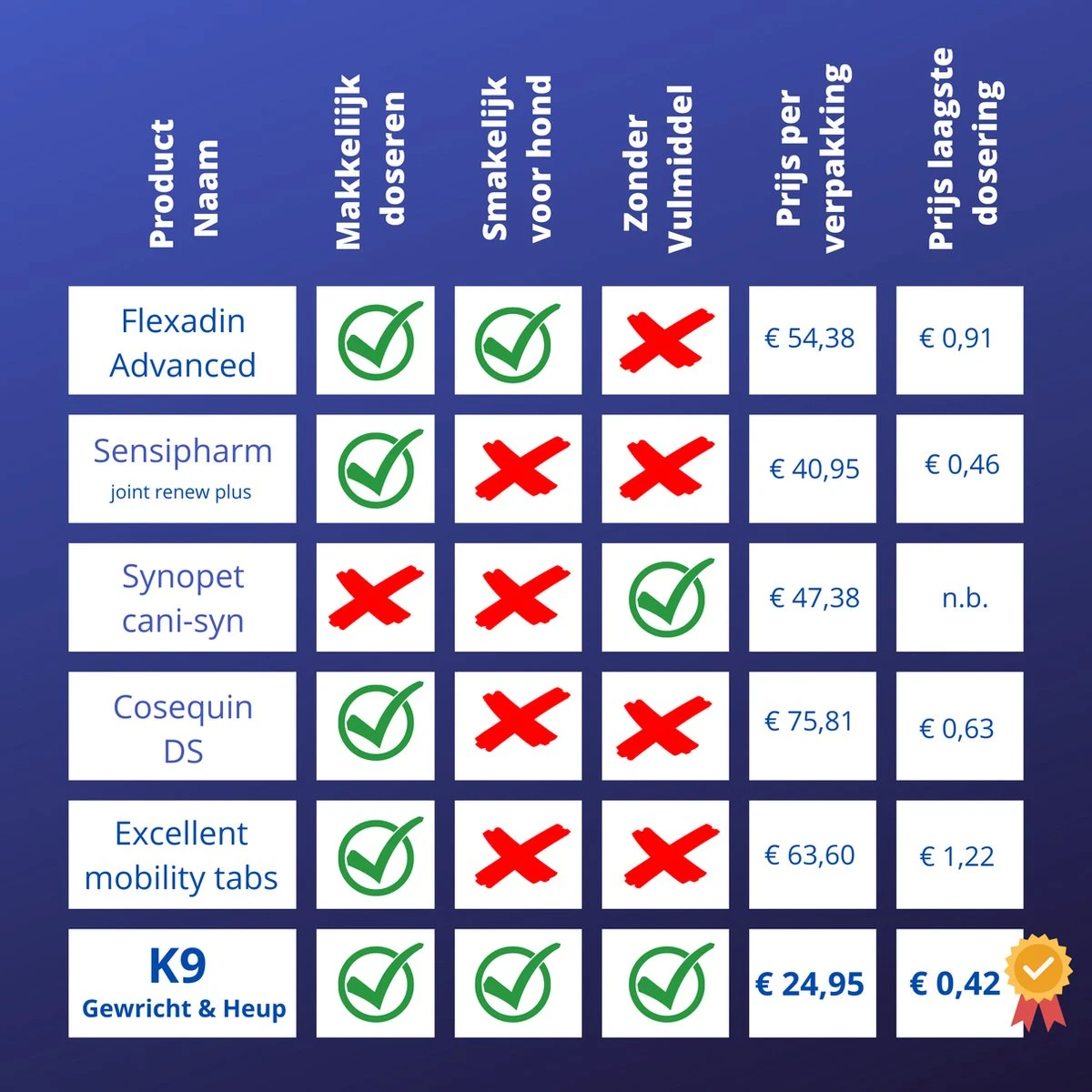 K9 Laboratories gewricht & heup supplement voor oude honden. Bij mank lopen, moeite met opstaan, (ouderdoms)artose, HD (heupdysplasie), ED (elleboogdysplasie).