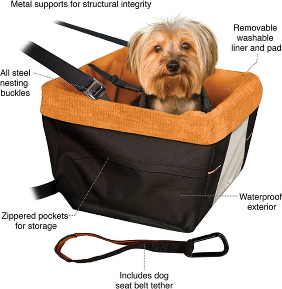 De buitenkant van de autostoel is waterbestendig en de binnen voering kan gewassen worden. Zodat je de stoel gemakkelijk schoon kunt houden. De autostoel is volledig inklapbaar en dus eenvoudig op te bergen. De stoel heeft een veiligheidsgordel welke aan een harnas of halsband kan worden vast gemaakt.