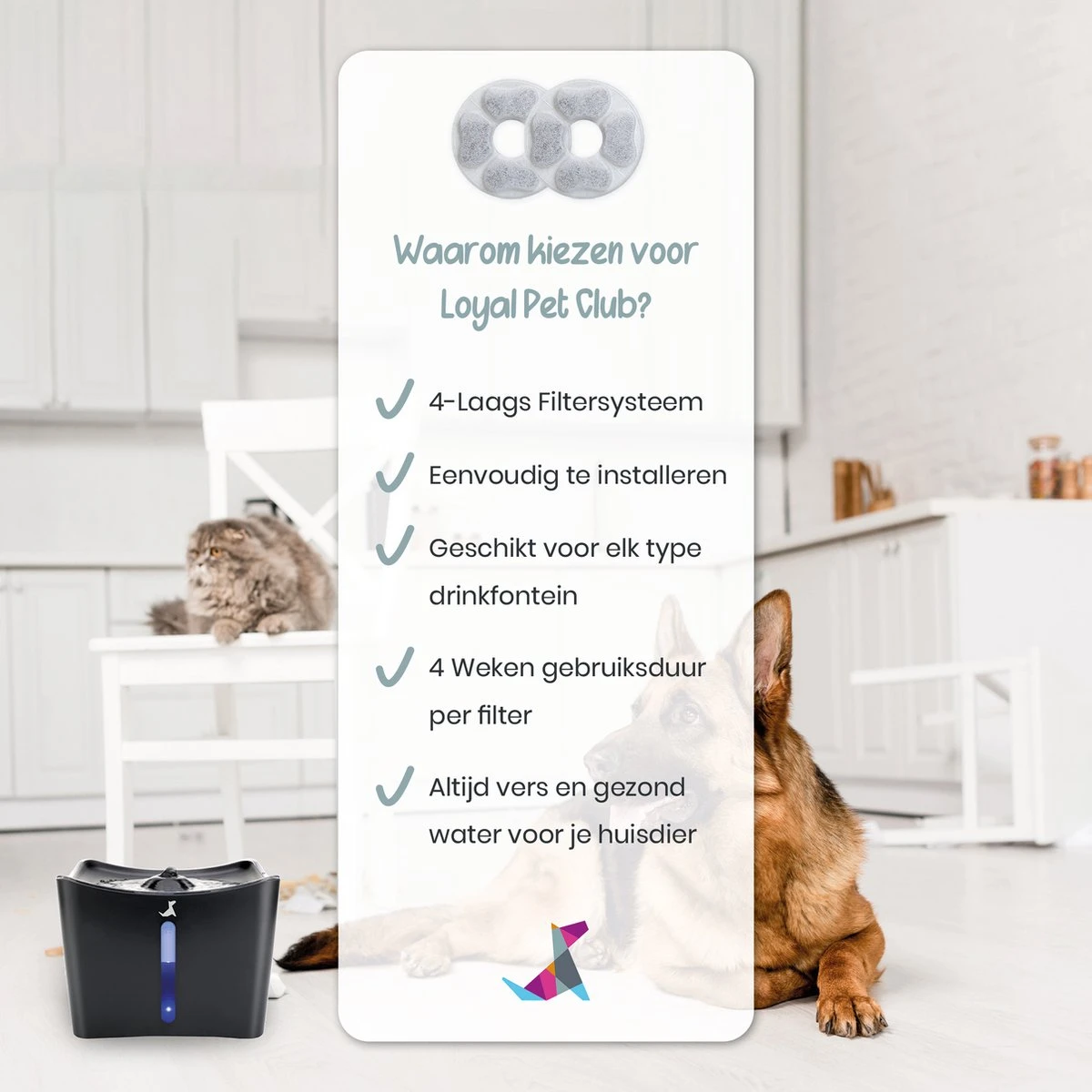De Loyalpetclub® drinkfontein navulling set bestaat uit 6 hoogwaardige koolstoffilters. Perfect! Met deze hoogwaardige koolstoffilters heeft je huisdier altijd schoon water, wordt viezigheid tot op het laatste stofje verwijderd en haal je het meeste uit jouw kattenfontein.
