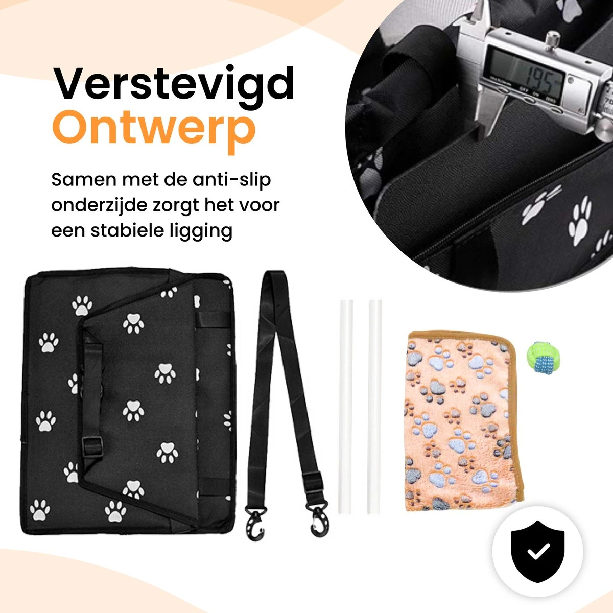 De honden autostoel is gemaakt van kwalitatief hoogwaardig materiaal en zowel de voor- als achterzijde zijn voorzien van een verstevigd PE boord. Aan de binnenzijde van de autostoel zit een ingebouwde lijn, zo reist je hond altijd veilig met je mee. Doormiddel van de meegeleverde verstevigingstubes kan je de zijkanten van extra versteviging voorzien, zodat het niet onnodig zal verschuiven tijdens het rijden.