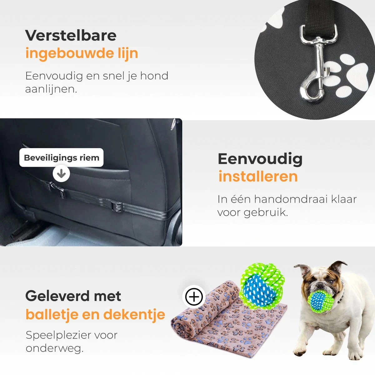 Bij aankoop van de honden autostoel ontvang je tevens een kleedje en een balletje. Het kleedje is gemaakt van fleece materiaal, waardoor het fluweelzacht aanvoelt en je hond optimale comfort tijdens de autorit. Het balletje zorgt ervoor dat je hond kan spelen en zich niet verveelt. Ook ontvang je een leuk e-book met tips en tricks over honden.