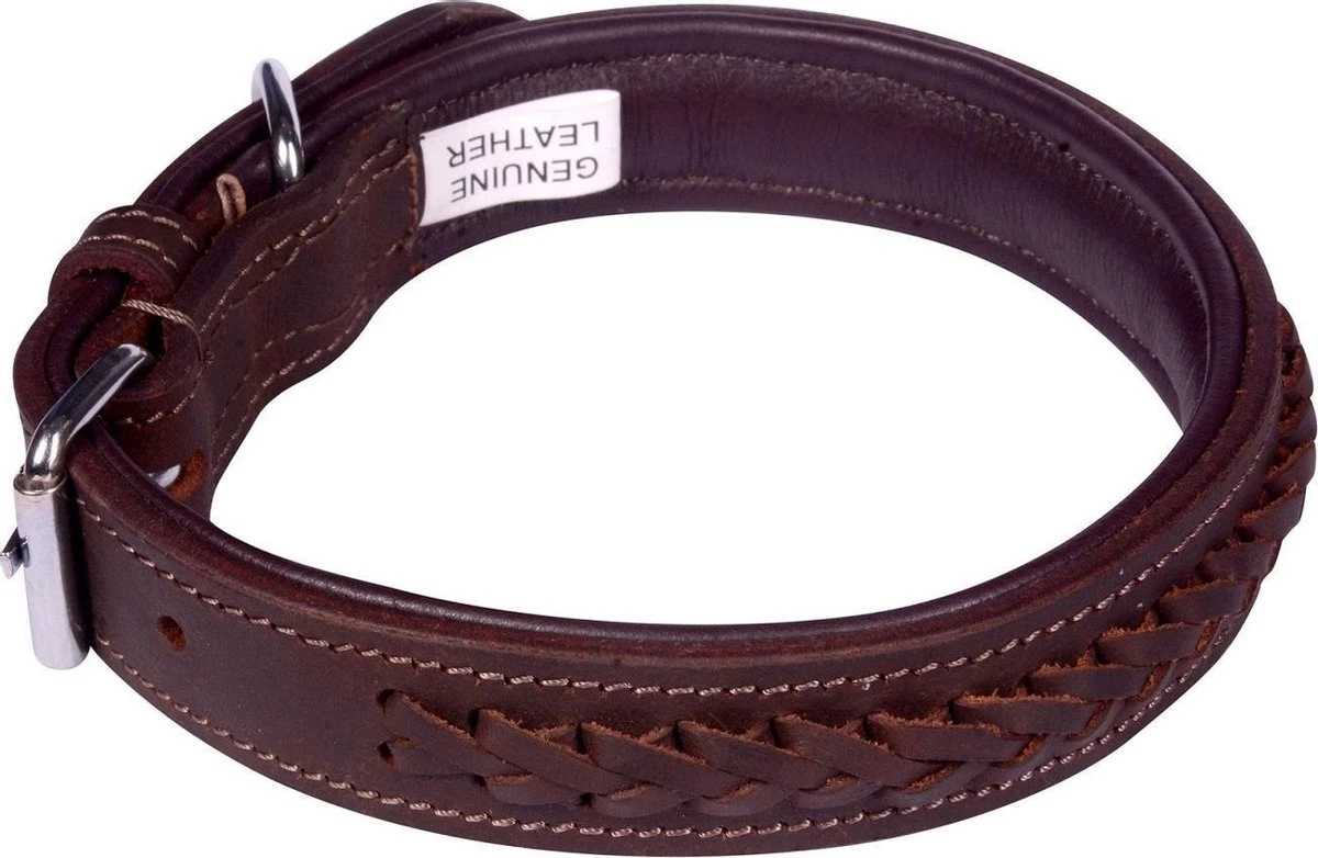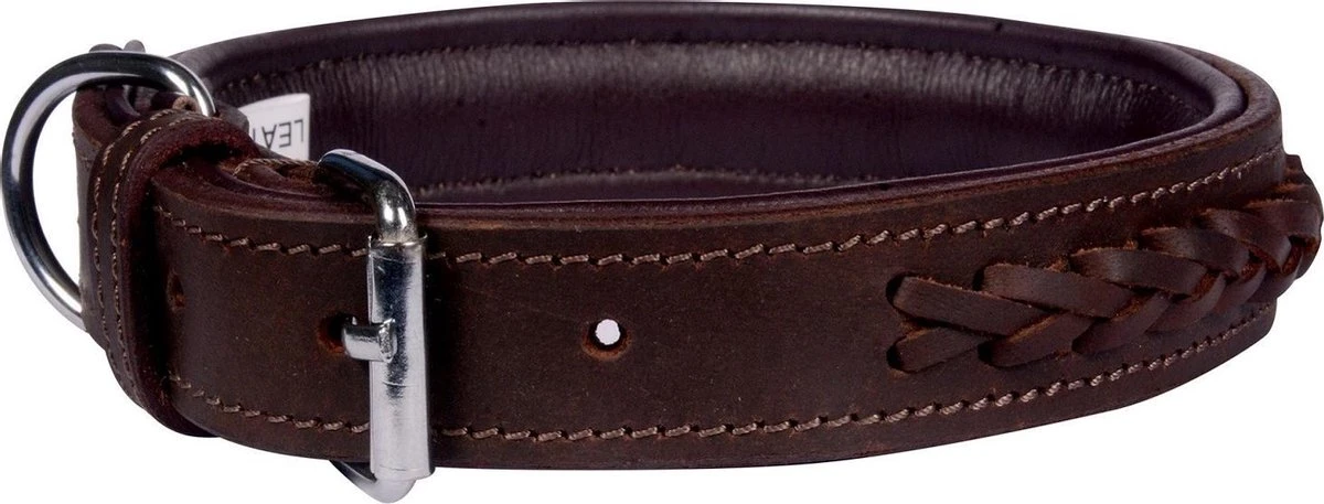 Een mooie en stoere hondenhalsband gemaakt van hoge kwaliteit leer. De halsband is versierd met vlechtwerk.
