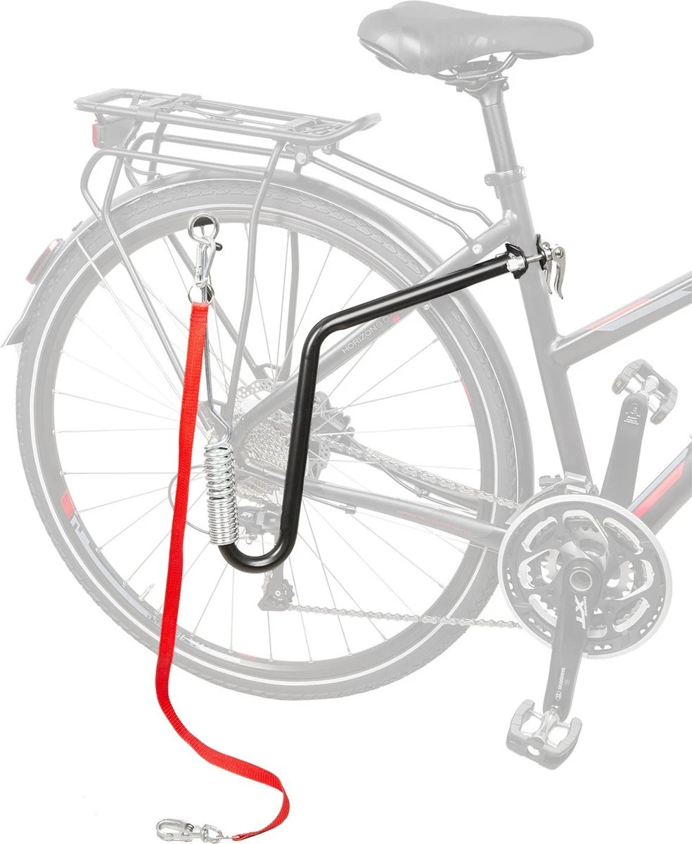 Deze hondenlijn kan op je fiets bevestigd worden en zorgt ervoor dat je hond altijd op een veilige afstand naast je fiets loopt. Het trekken van de hond wordt verzacht door de veer, veiliger voor jou en je hond dus! Ook geschikt voor grotere/zwaardere honden.