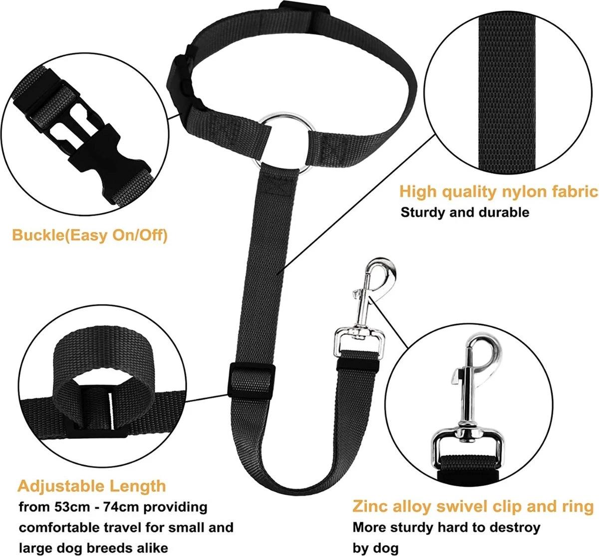 - Hoofdsteunsteunontwerp: de autogordel voor honden is ontworpen met hoofdsteunsteun. De autogordel voor honden kan worden gebruikt in alle voertuigmodellen met een hoofdsteun. De riemcirkel die aan de hoofdsteun hangt, is verbonden door een vergrendelbare snelsluiting. Voorkom dat de clip (niet passende gesp) loskomt van de gordelsluiting en zorgt ervoor dat uw huisdier veilig is.