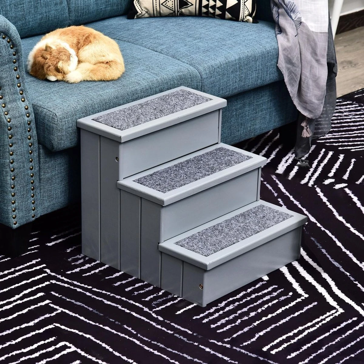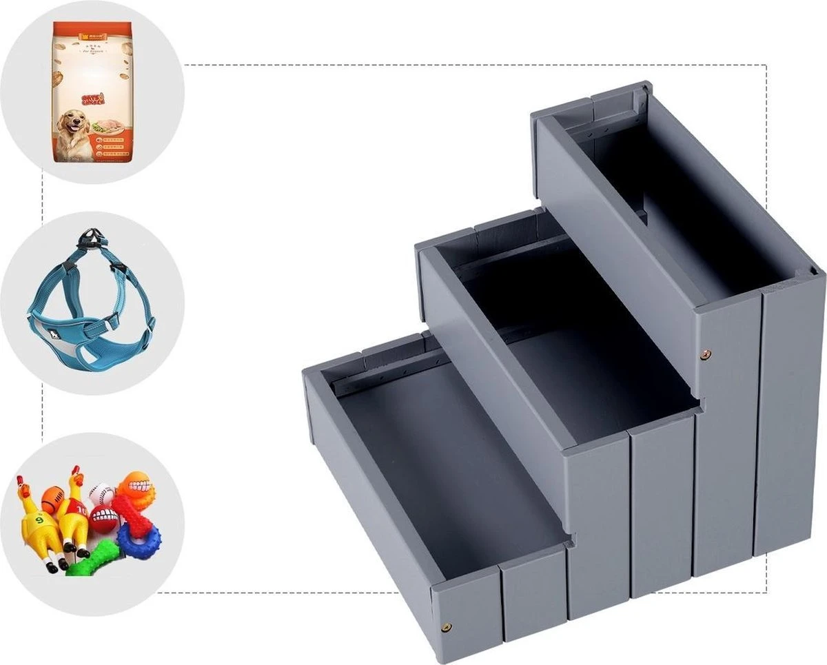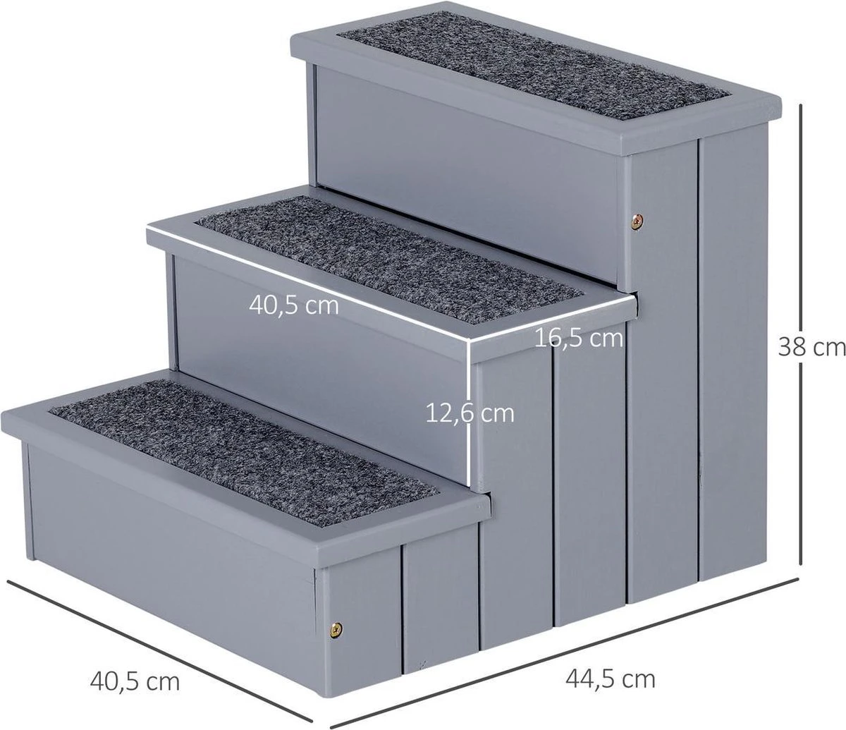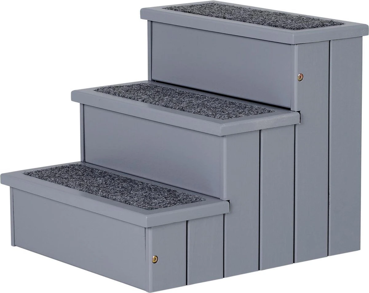 Vooral oudere huisdieren hebben vaak mobiliteitsproblemen. Dit is waar de huisdierentrap kan helpen. Hiermee kunnen bijvoorbeeld oude of bijzonder kleine honden gemakkelijk op de bank of in de auto stappen. Er is ook veel opbergruimte onder de treden die plaats biedt aan allerlei soorten dierenbenodigdheden. De trappen zijn gemaakt van stevig grenenhout, de afzonderlijke treden zijn voorzien van antislip naaldvilt.