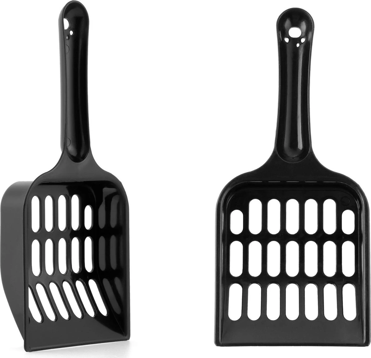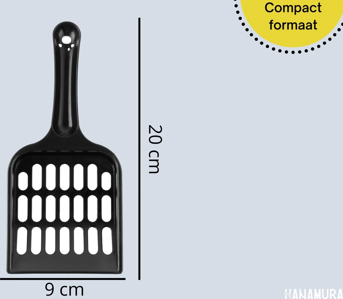 De schep is voorzien van grove gaten waar alle soorten kattengrit en kattenbakvulling doorheen vallen. Op die manier schep je echt alleen de grote klonten eruit. Het handvat van de kattenbakschep is voorzien van gaatjes waarmee je deze eventueel kunt ophangen.