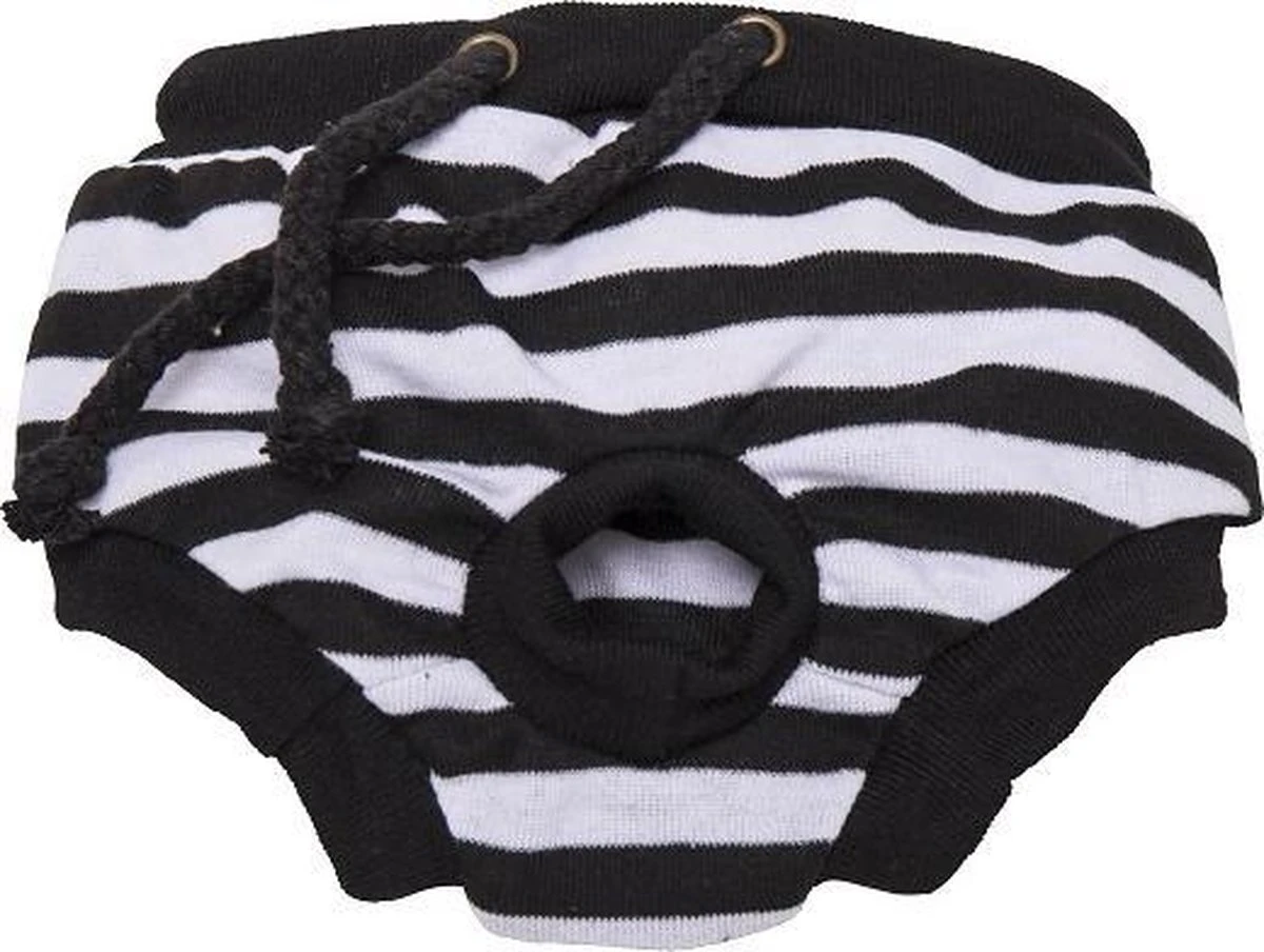 Dit gestreepte loopsheidbroekje voor de hond is verkrijgbaar in verschillende kleuren en maten. De maat is afhankelijk van de buikomtrek van de hond.