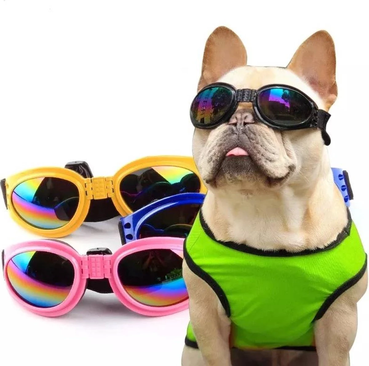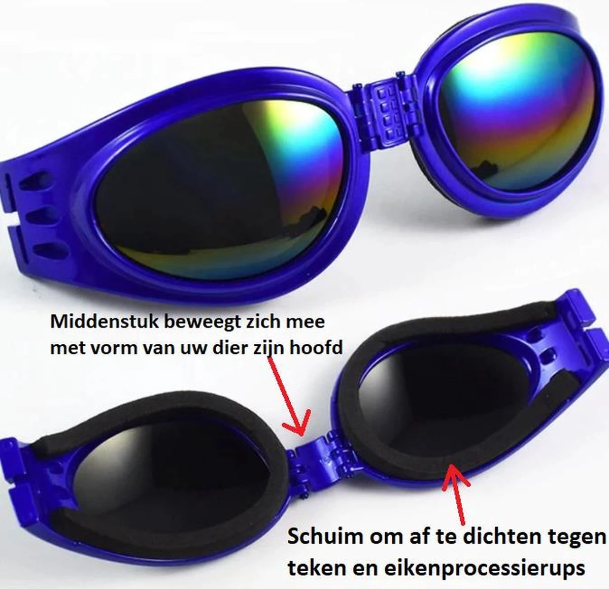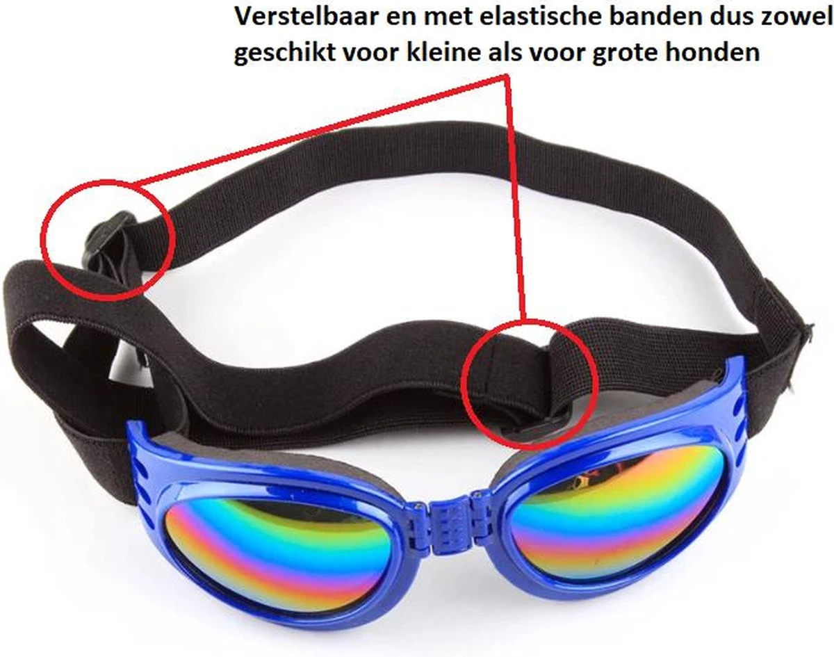 UV-zonnebril voor honden. Deze bril is perfect voor wie zijn hond wel eens meeneemt op de fiets, op de motor, of wanneer uw hond ervan houdt om zijn kop uit het autoraam te steken. Daarnaast biedt deze bril bescherming tegen eikenprocessierupsen en teken wanneer u met uw hond naar het bos gaat.