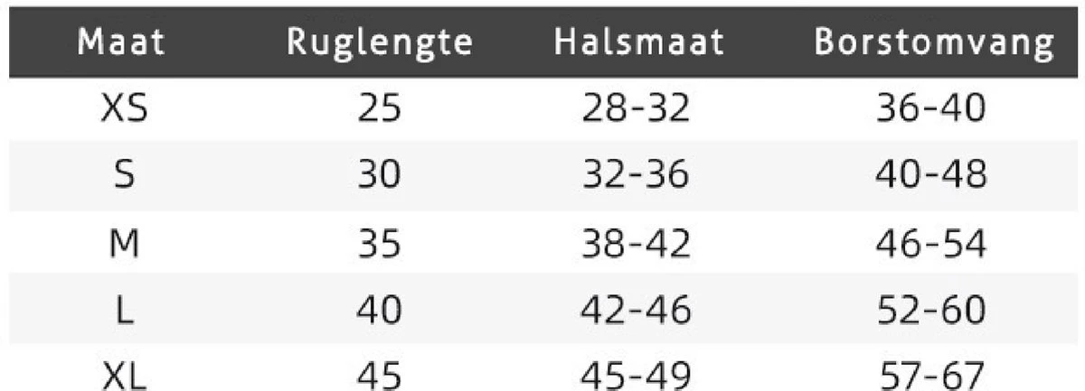 Maat XS: Rug: 25cm Borst: 36-40cm Nek: 28-32cm