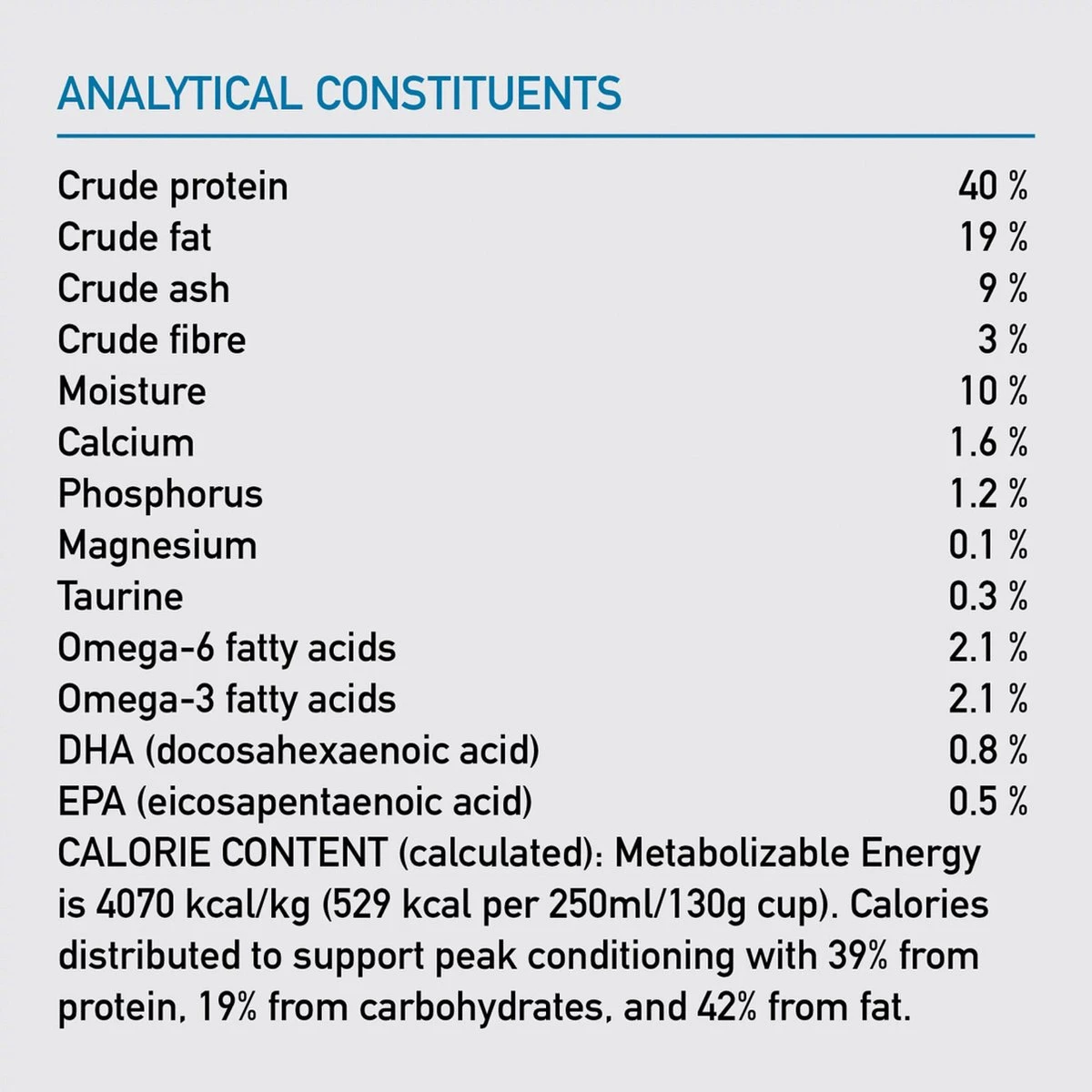 | Analytische bestandsdelen | Ruw eiwit 42 % Ruw vet 20 % Ruwe as 9 % Ruwe celstof 3 % Vocht 10 % Calcium 1,7 % Fosfor 1,3 % Magnesium 0,1 % Taurine 0,3 % Omega-6 2,1 % Omega-3 2,1 % DHA / EPA 0,8 % / 0,5 % |