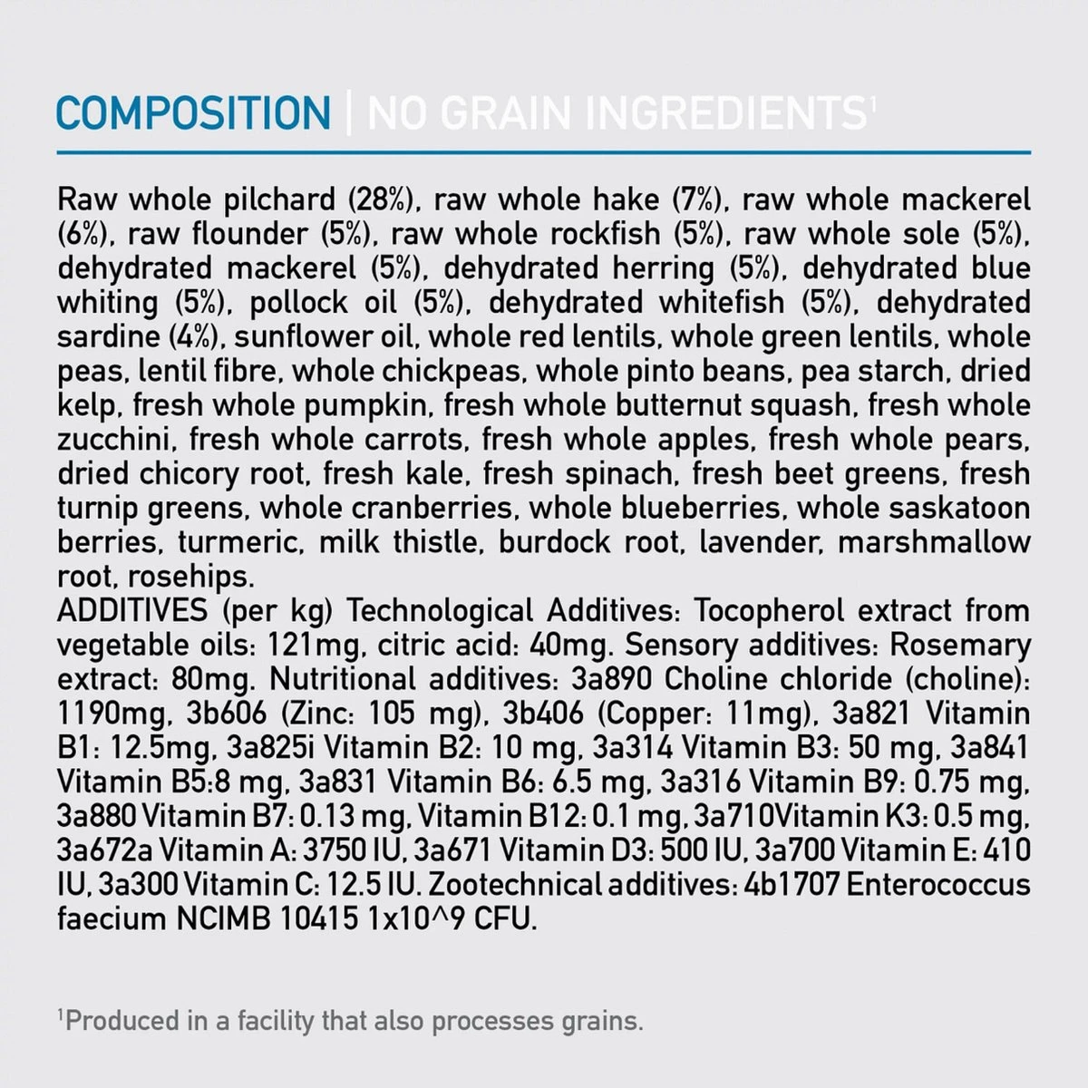 | Voedingswaarde | Verse hele sardine (25%), Verse hele Pacifische heek (9%), Verse hele Pacifische horsmakreel (8%), Verse Pacifische Pijltandheilbot (5%), Verse hele rock vis (5%), Verse hele Amerikaanse schol (5%), Hele makreel (gedroogd, 5%), Hele Haring (gedroogd, 5%), Hele blauwe wijting (gedroogd, 5%), Haring olie (5%), Pacifische kabeljauw (gedroogd, 5%), Hele rode linzen, Hele groene linzen, Hele groene erwten, Zonnebloem olie (koud geperst), Hele sardine (gedroogd, 1.5%), Linzen vezel, Hele kikkererwten, Hele gele erwten, Hele kievitsbonen, Kabeljauw lever (gevriesdroogd), Gedroogde bruine zeewier, Verse pompoen, Verse muskuspompoen, Courgette, Pastinaak, Verse hele wortelen, Verse Red Delicious appels, Verse Bartlett peren, Verse cranberries, Verse bosbessen, Verse groene boerenkool, Verse spinazie, Rode bieten loof, Raapstelen, Cichoreiwortel, Kurkuma, Mariadistel, Kliswortel, Lavendel, Heemstwortel, Rozenbottels. |