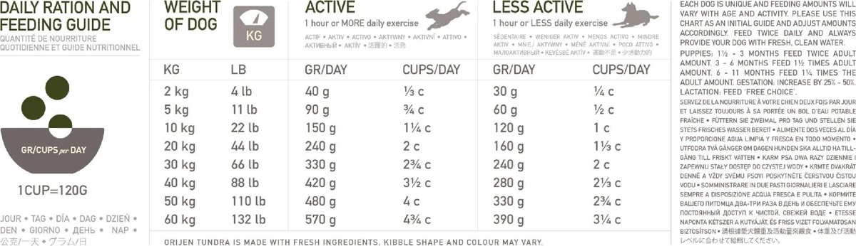 | Voedingsadvies | Om uw hond echt te laten genieten van Orijen Freeze Dried, voeg 4 eetlepels (60 ml) warmwater per medaillon toen en serveer na 5 minuten. Iedere hond is uniek, de voedingshoeveelheid kan varieren afhankelijk van klimaat, leeftijd en mate van activiteit. Monitor het gewicht van uw hond en pas voedingshoeveelheid aan indien nodig. <br />Voed uw hond tweemaal per dag en zorg altijd voor voldoende vers en schoon drinkwater. Reeds aangemaakte restjes bewaren in de koelkast, na 3 dagen niet meer gebruiken, bezoeken ons on-line voor de voedingscalculator en voor meer gedetailleerde voedingsinformatie.<br /><br />Gewicht hond (kg)Aantal medallions<br />21,5<br />32<br />53<br />74<br />115,5<br />157<br /><br />Puppies:<br />1-3 maanden oud; twee keer de volwassen hoeveelheid.<br />3-8 maanden oud; 1,5 de volwassen hoeveelheid.<br />8 maanden tot de volwassen leeftijd; 1,25 van de volwassen hoeveelheid. |