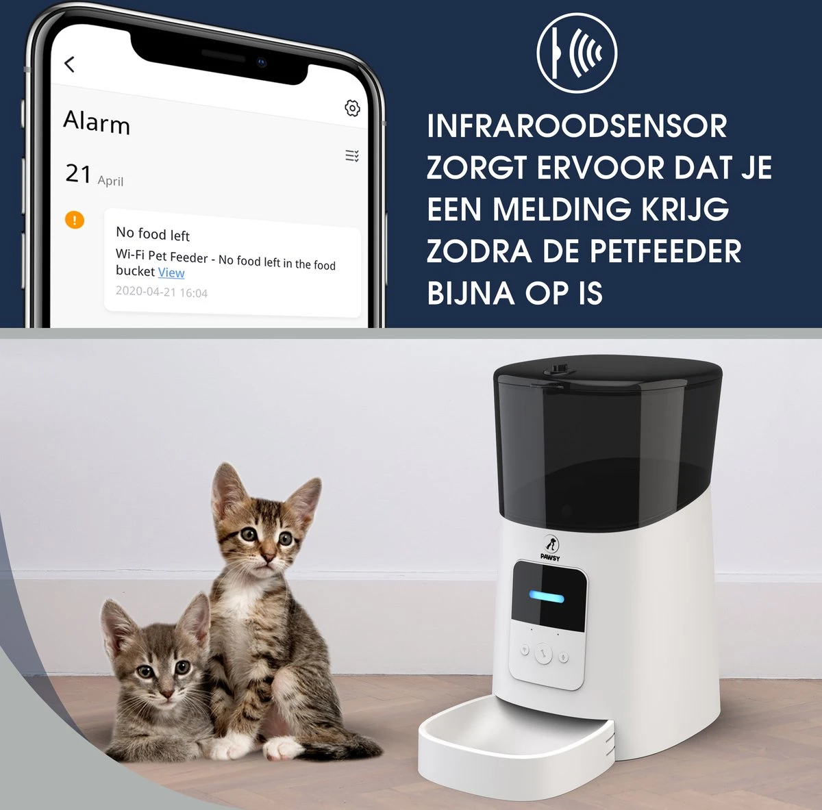 - Notificaties houden je op de hoogte als de Pawsy voerbak bijgevuld moet worden
