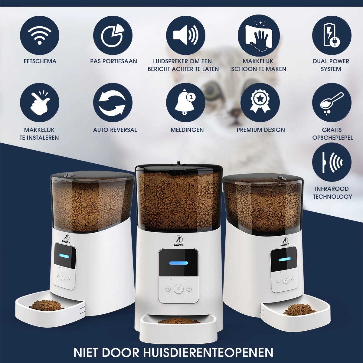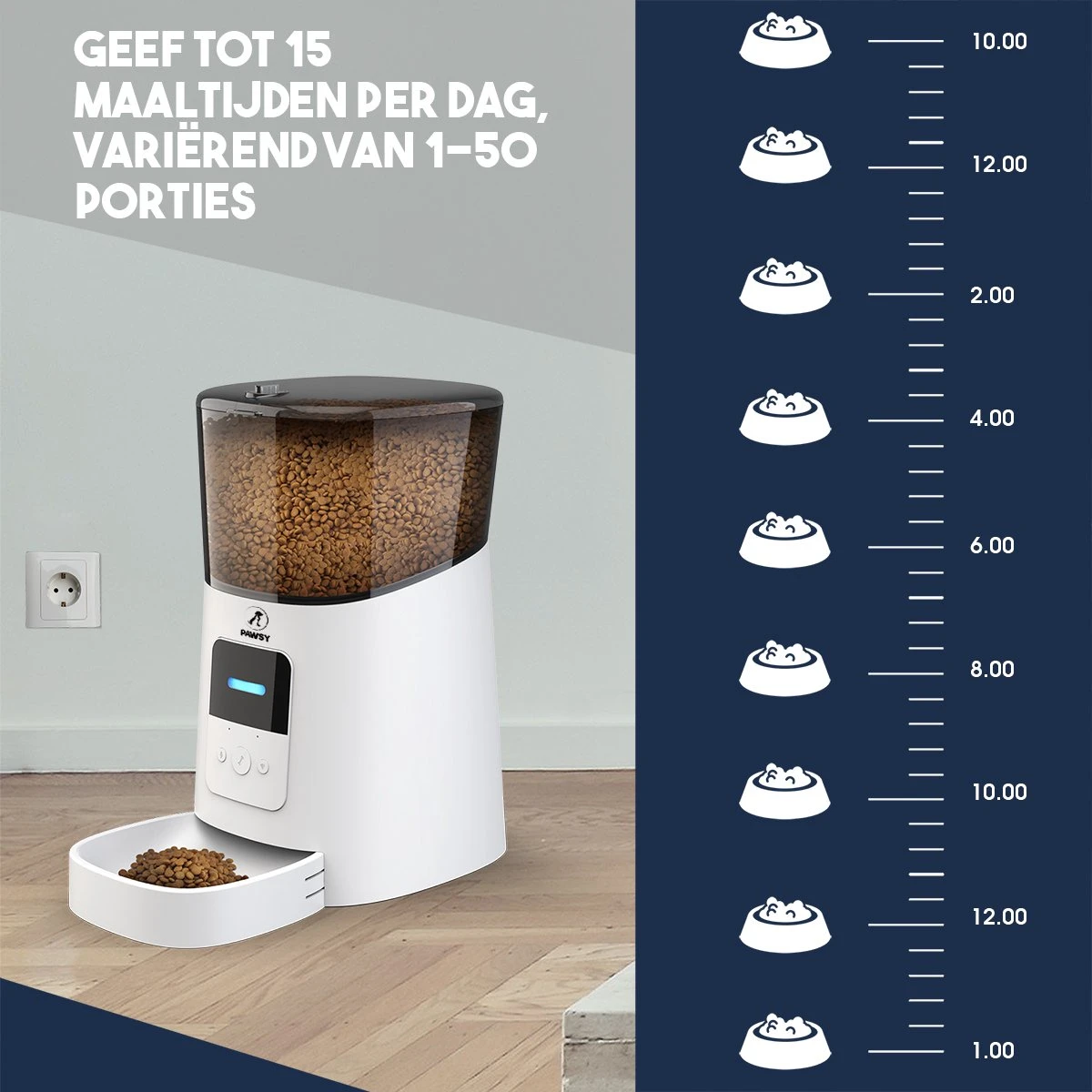 Met de Automatische Voerbak van Pawsy kan je via de exclusieve Smart App op afstand je huisdier automatisch, of handmatig tot wel 15 maaltijden per dag voorzien. Variërend van 1 tot 50 porties. Doordat de Pawsy Voederbak op netstroom of batterijen werkt, ben je er zeker van dat de Pawsy voerbak altijd werkt. Bovendien kan je met de opname functie een bericht van maximaal 10 seconden achterlaten voor je huisdier. Ook krijg je er een gratis opscheplepel bij waarmee je ook nog eens een voedselzak kan afsluiten. Wel zo handig!