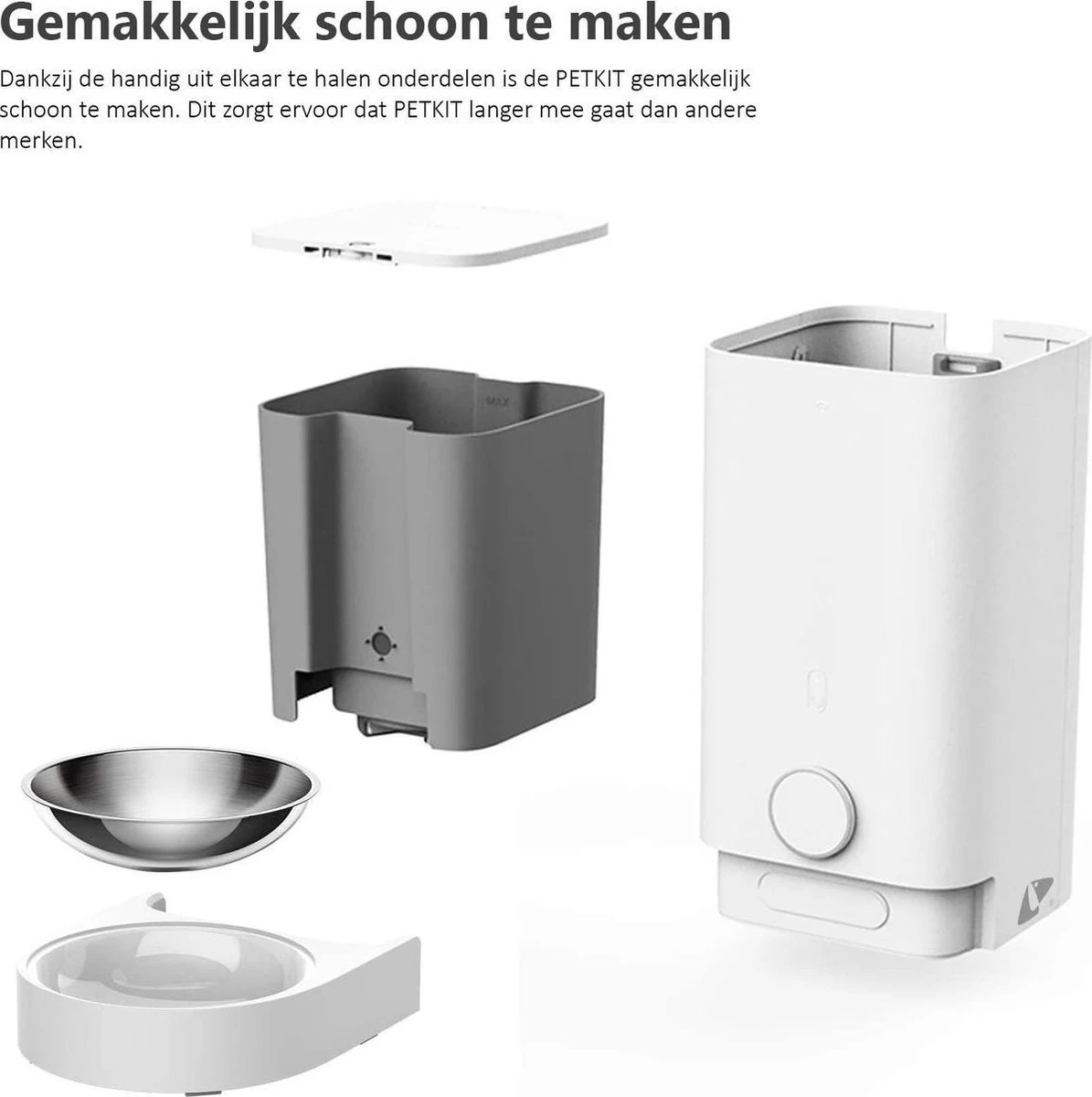 De magnetische roestvrijstalen voerbak is gemakkelijk uit het apparaat te halen. Het voedingsreservoir is een aparte bak in de behuizing. Zo is het schoonmaken gemakkelijk en bespaart het veel tijd.