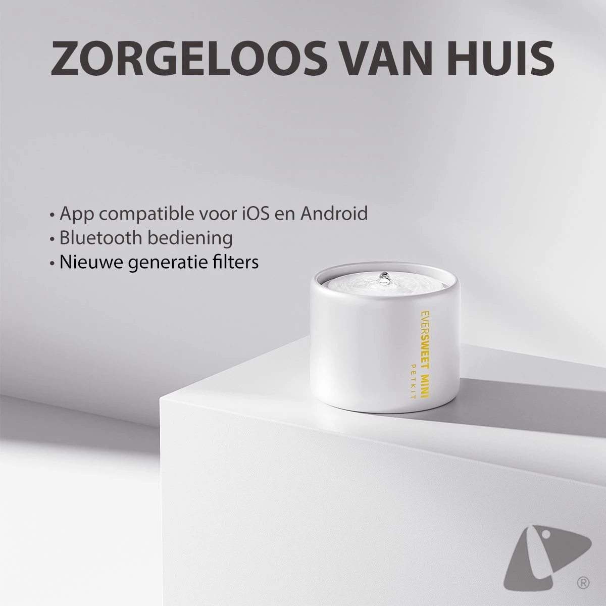 Maakt u zich zorgen of uw kat of hond te weinig drinkt? Voor onze trouwe viervoeters is het ontzettend belangrijk voor de nieren dat ze voldoende drinken. Dit houdt ze vitaler en gezonder. Dankzij de PETKIT Eversweet 5 Mini wordt drinken gestimuleerd! Door de Eversweet 5 Mini hoeft u zich geen zorgen meer te maken dat uw huisdier niet is voorzien van vers water. Dankzij het stromende water wordt uw huisdier gestimuleerd meer te drinken. Deze ultra-stille drinkfontein is klein in gebruik en gemakkelijk mee te nemen. De drinkbak is te gebruiken via Bluetooth en in te stellen via de App. Dit zorgt ervoor dat u zorgeloos van huis kunt gaan en dat uw huisdier een week lang is voorzien van vers stromend water.
