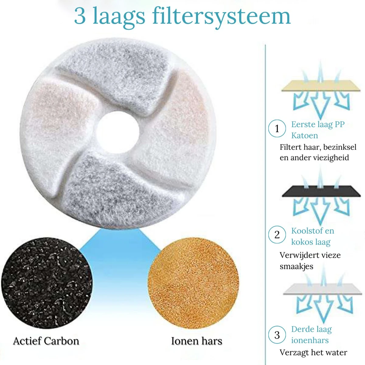 De meeste honden of katten drinken niet voldoende per dag. Onze drinkfontein kan daar een betere uitkomst in bieden om jouw hond of kat meer te laten drinken. Het stromende water prikkelt de zintuigen van uw huisdier en verhoogt de drink intentie. Overigens zorgt het drievoudige circulatiesysteem ervoor dat het water constant in beweging blijft. Dit zorgt voor het maximale zuurstofgehalte in het water. Daarnaast wordt bij iedere circulatie het water gefilterd zodat het water altijd bacterievrij is!