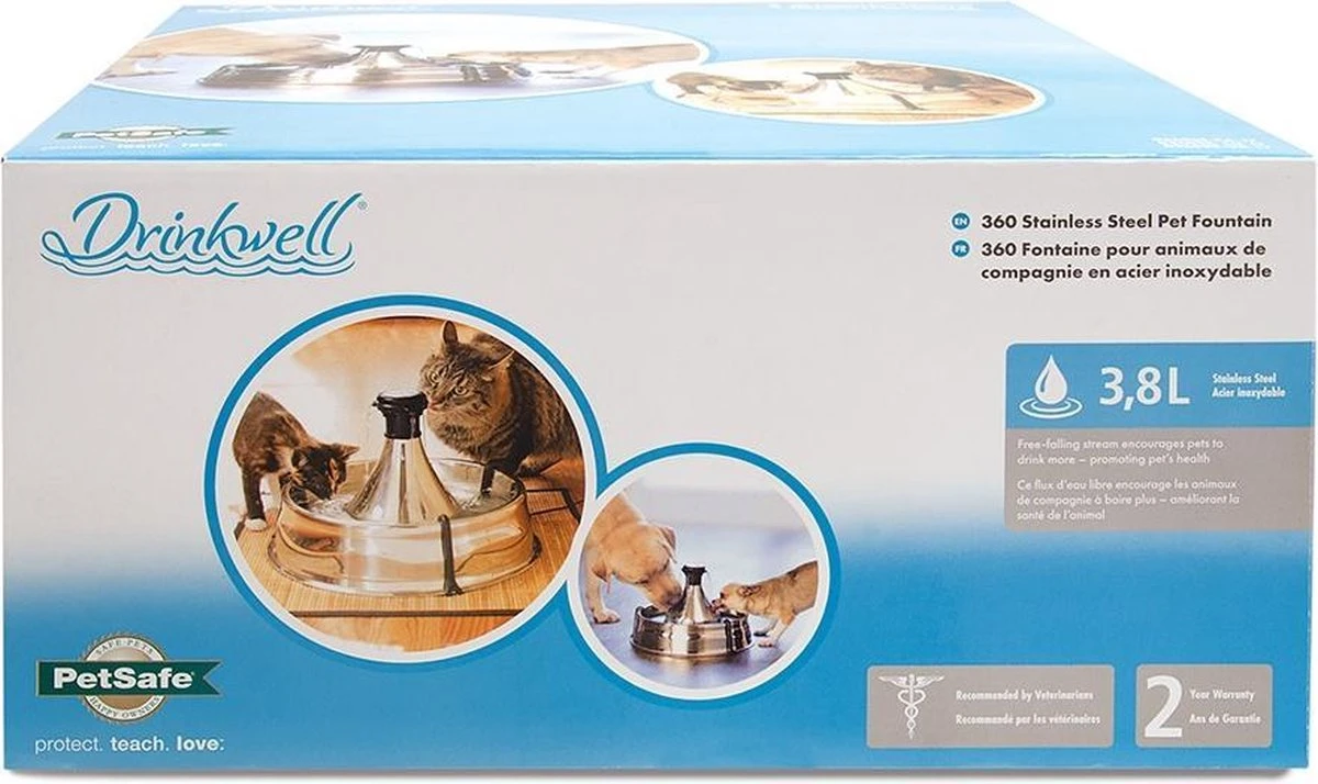 PetSafe Drinkwell 360 Stainless Steel Pet Fountain is een RVS drinkfontein. Deze waterfontein circuleert en filtert continu het water van jouw hond of kat, waardoor het schoner en frisser blijft dan in een normale waterbak. Deze fontein biedt 3,8 liter vers, gefilterd water in een RVS ontwerp dat gemakkelijk schoon te maken is! Het ronde ontwerp maakt hem gemakkelijk van alle kanten benaderbaar. Meerdere vrijvallende waterstromen (zoals water uit de kraan) voegen zuurstof toe voor frisheid en moedigen huisdieren aan om meer te drinken.
