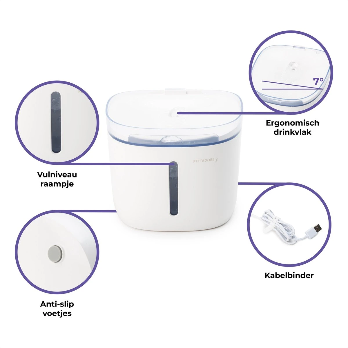 De Pettadore Hydrate Compact drinkfontein bevat een hangende pomp, wat zorgt voor een goede geluidsdemping welke comfort biedt aan jou en je huisdier. De pomp is krachtig en geeft een fijne stroom water recht naar het midden afstromend die katten en honden aantrekkelijk vinden. De kattenfontein heeft een filter met 4 filtermethodes die meegeleverd wordt. Deze filter is van onschadelijk materiaal wat het veilig maakt voor jouw katten en honden.
